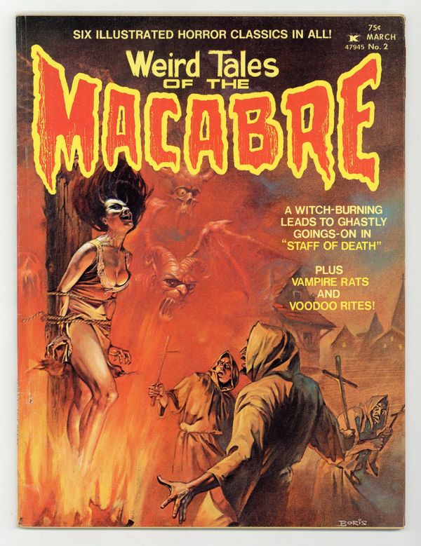 $27.50Macabre comics and stories, including an adventure of Bog Beast, a Swamp Thing knockoff who also appeared in the comic Tales of Evil. Stories and art by Al Moniz, Gabe Levy, George Kashdan, Pat Boyette, Leo Summers, John Severin, Badia Romero and Spanish artist Xirinius. Also, an article on the films of Edgar Allen Poe. Part of the short-lived Atlas line from former Marvel publisher Martin Goodman. Magazine format. Black and white; 64 pages. Cover by Boris Vallejo. Cover price $0.75.