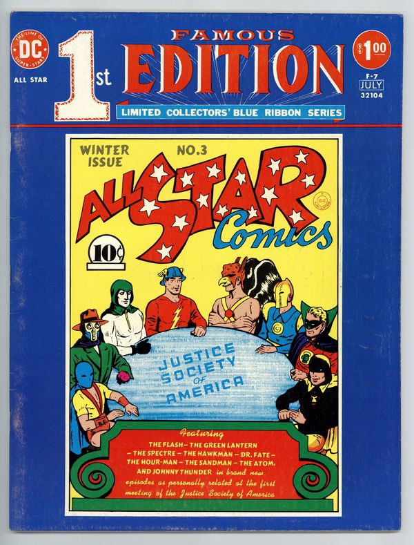 Famous First Edition Limited Collectors' Blue Ribbon Series #F7: All-Star Comics #3. Reprints All-Star Comics #3 (1st Justice Society) including the original ads. NOTE: This almost exact replica edition is 10 x 13-1/2" (about the size of a Life magazine). The original, 1940 first edition is standard comic book size. Cover price $1.00.