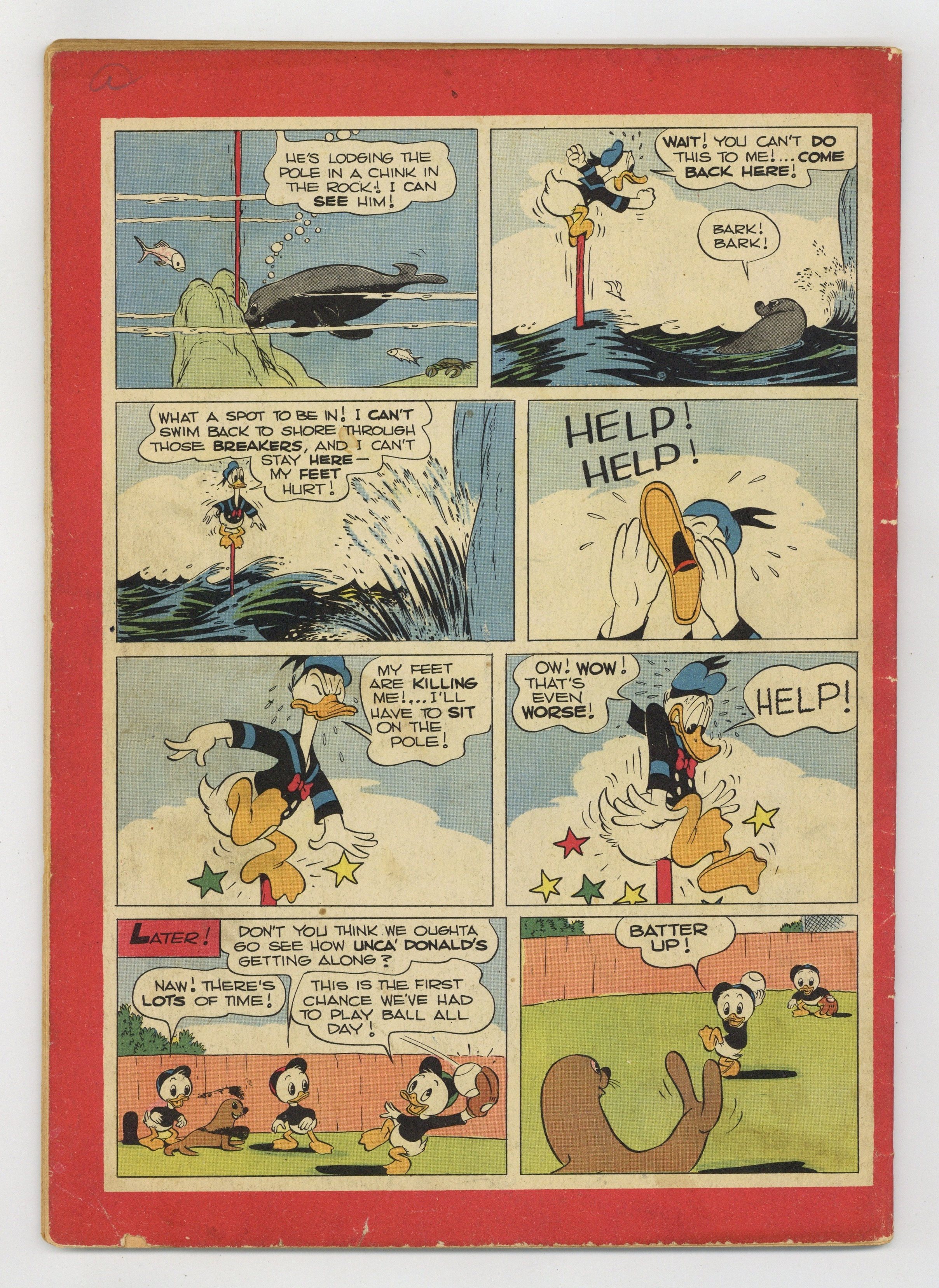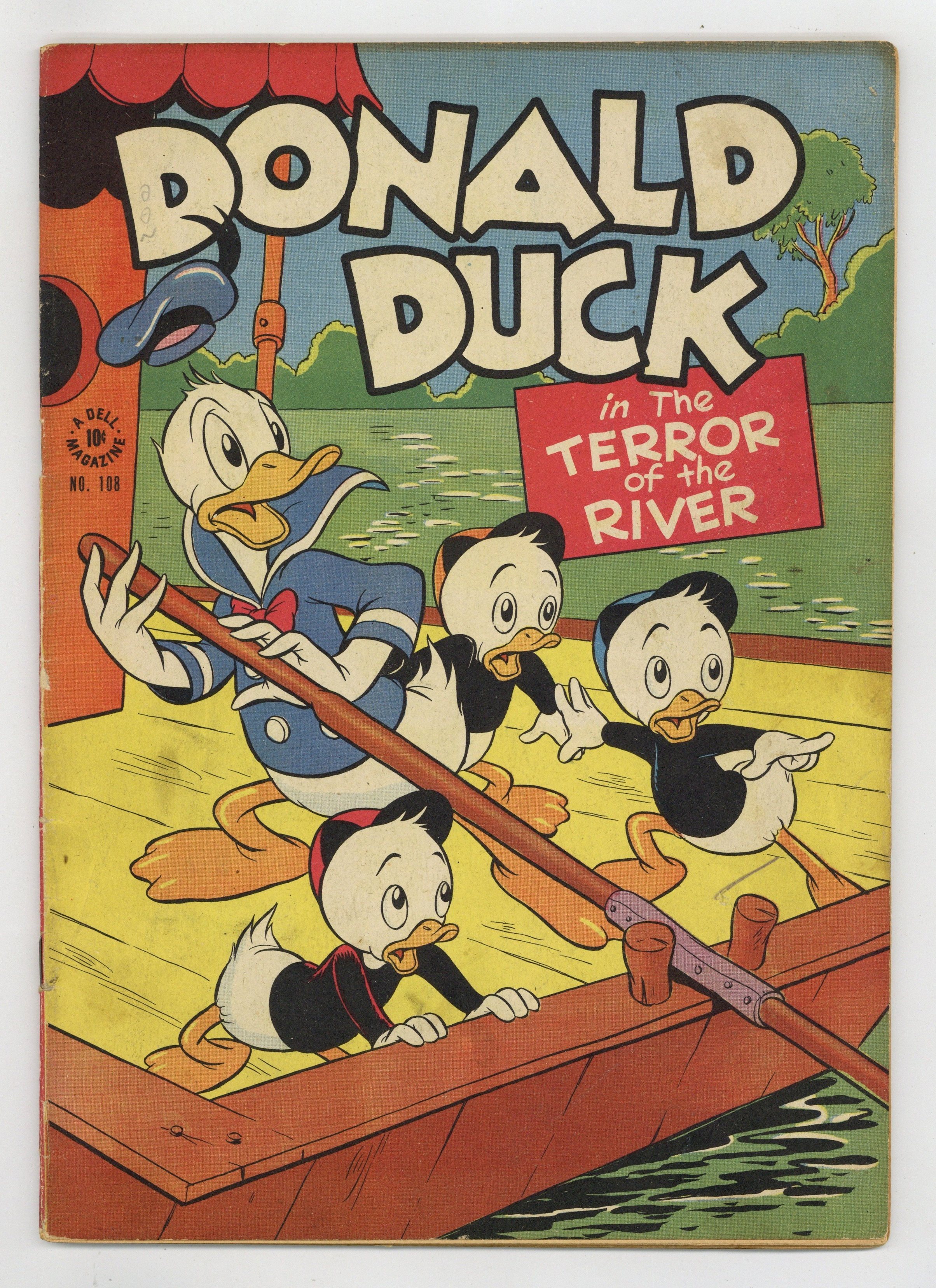 Indicia title is "DONALD DUCK in the Terror of the River, No. 108." Cover art by Carl Buettner. The Terror of the River!!, script and art by Carl Barks; Donald's sneezes at an auction are mistaken for bids on a houseboat and soon he and the nephews are sailing down the Ohio River; There they encounter a huge serpent. The Firebug, script by Carl Barks, art by Carl Barks; Carl Buettner (last two panels only); Donald falls on his head when getting up one morning and turns into a pyromaniac, setting harmless fires but also getting the blame for big fires set by another firebug. Seals Are So Smart, script and art by Carl Barks; The nephews play ball at the beach with a baby seal, and this sets Donald to dreaming of how much money he could make with a trained seal act. 52 pages, full color. Cover price $0.10.