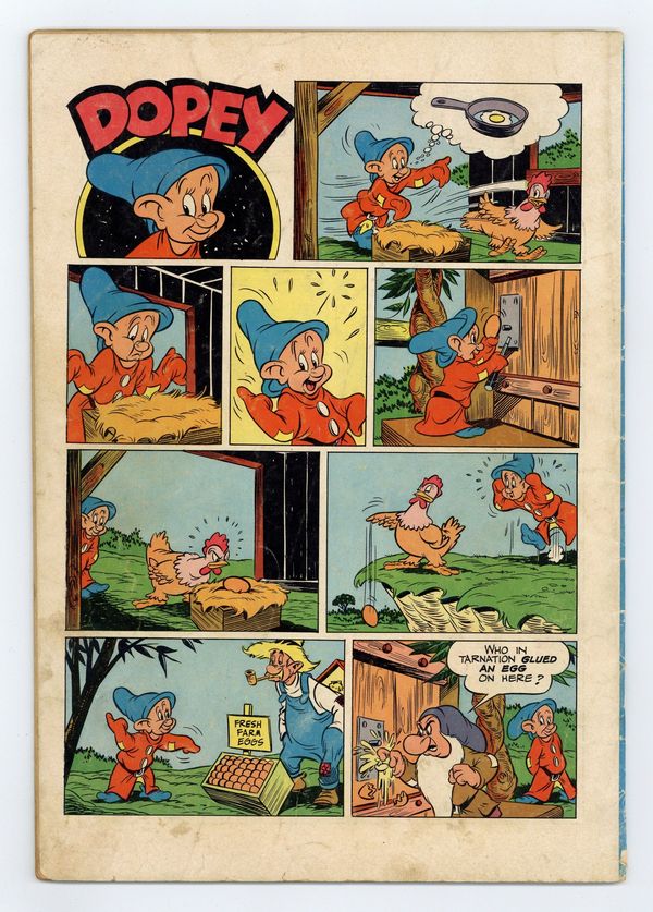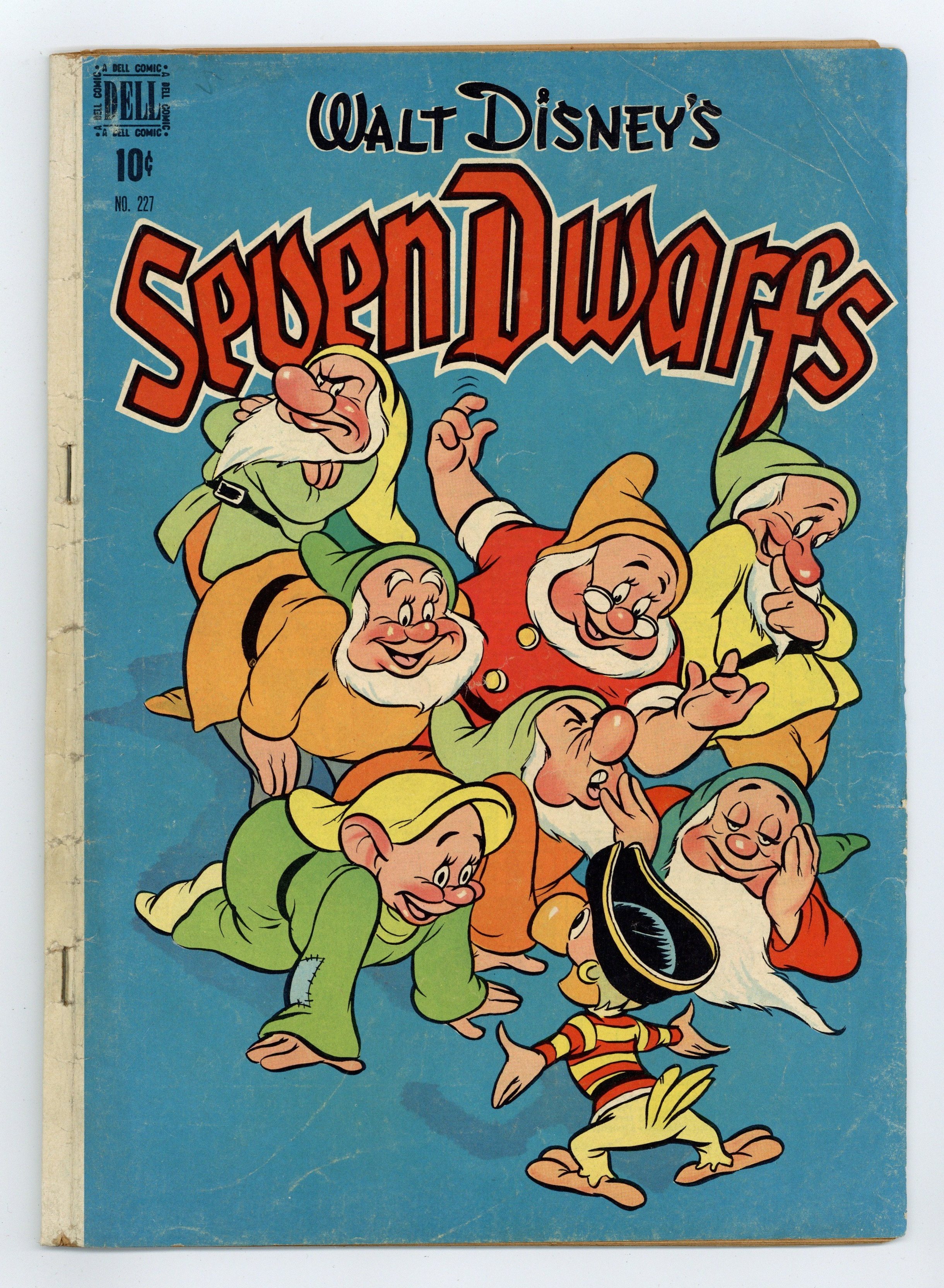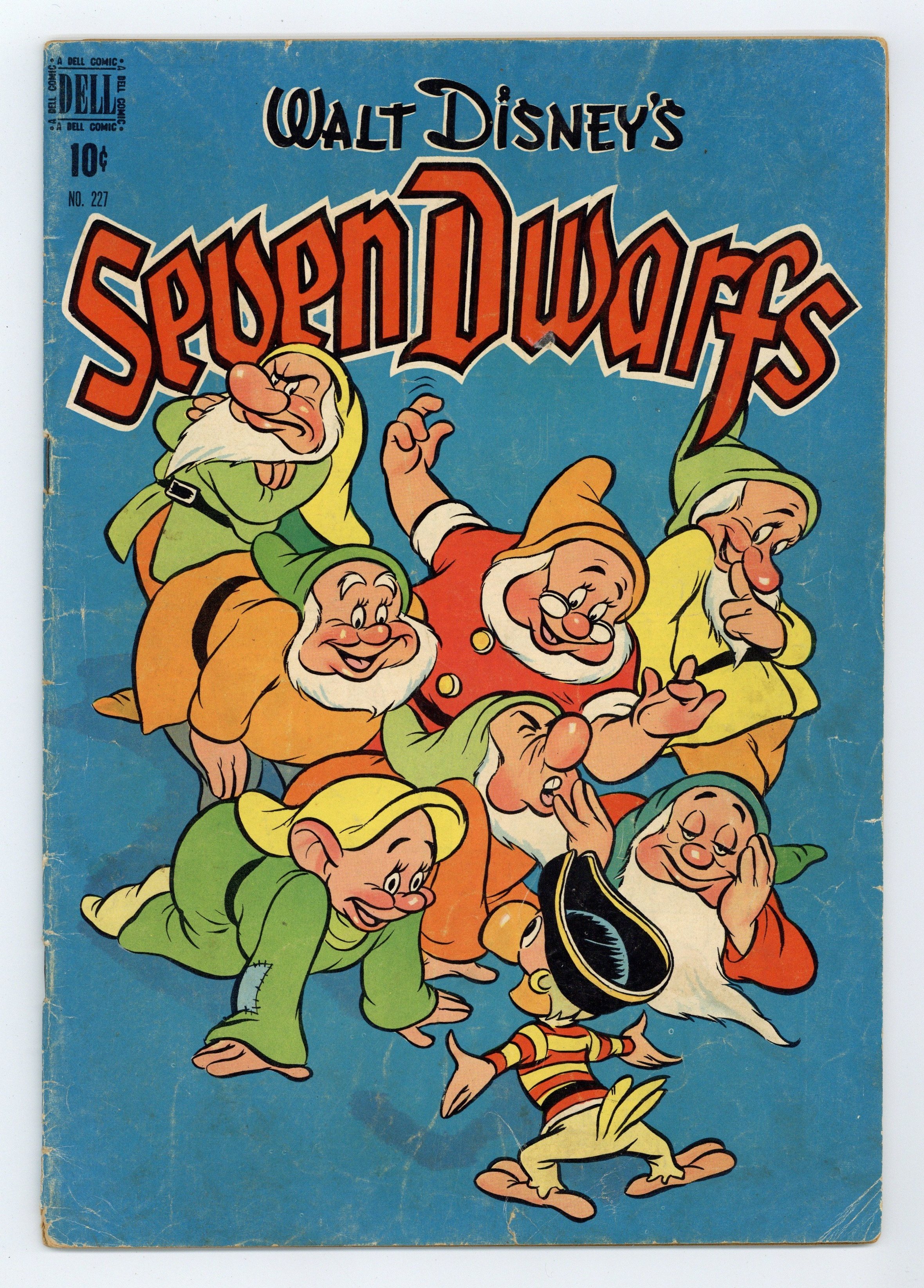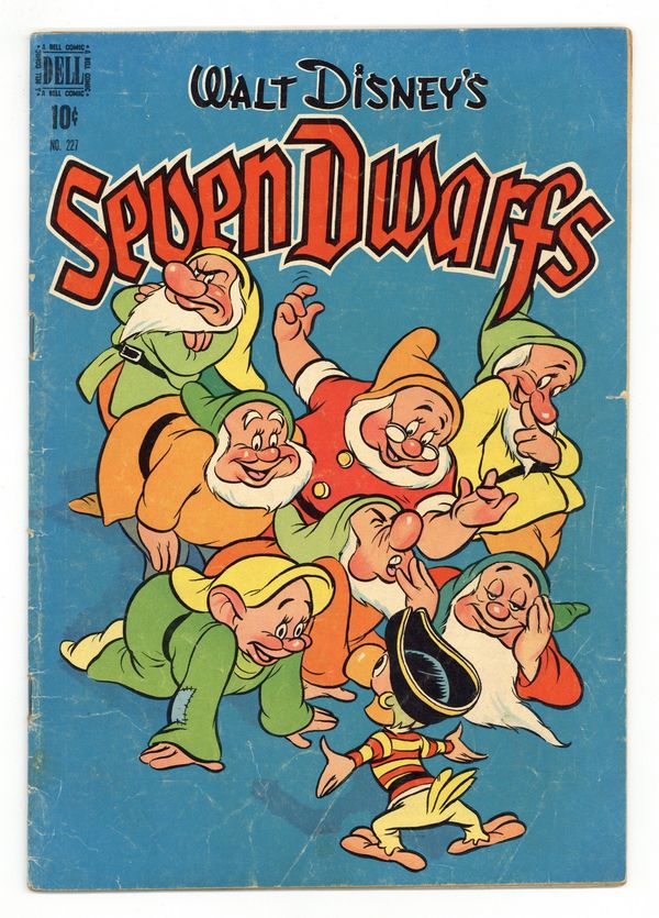 $18.75Indicia title is "Walt Disney's SEVEN DWARFS, No. 227." Cover art by Carl Buettner. The Seven Dwarfs and the Pirate, art by Tony Strobl; Yellow-Beak the parrot comes to the Dwarfs' house with a map of buried pirate treasure and convinces the Dwarfs to help him find it. The Dwarfs and Yellow-Beak set sail on a ship, but the Witch changes herself into a rat to hitch a ride to the isle where the treasure is buried. The Seven Dwarfs and Humpty Dumpty, script and art by Roger Armstrong; Humpty Dumpty's brother Gumpty falls for a trick contest and is captured by the Giant, who wants him for an omelet; Doc and Dopey come up with a plan to rescue him. 36 pages, full color. Cover price $0.10.