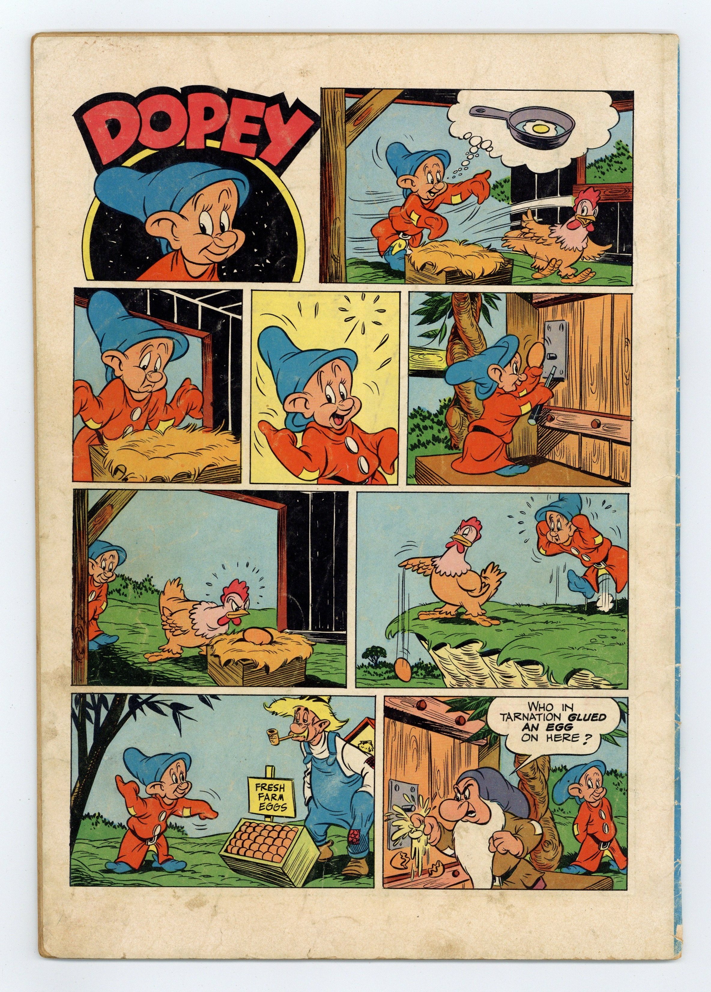 $33.00Indicia title is "Walt Disney's SEVEN DWARFS, No. 227." Cover art by Carl Buettner. The Seven Dwarfs and the Pirate, art by Tony Strobl; Yellow-Beak the parrot comes to the Dwarfs' house with a map of buried pirate treasure and convinces the Dwarfs to help him find it. The Dwarfs and Yellow-Beak set sail on a ship, but the Witch changes herself into a rat to hitch a ride to the isle where the treasure is buried. The Seven Dwarfs and Humpty Dumpty, script and art by Roger Armstrong; Humpty Dumpty's brother Gumpty falls for a trick contest and is captured by the Giant, who wants him for an omelet; Doc and Dopey come up with a plan to rescue him. 36 pages, full color. Cover price $0.10.