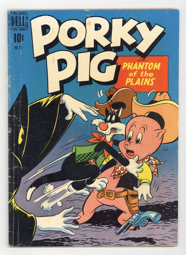 Indicia title is "PORKY PIG in PHANTOM OF THE PLAINS, No. 271." Cover art by Roger Armstrong. A Safe Drive, art by Fred Abranz; Porky has car trouble while taking Petunia for a drive and Petunia has to fix the problem. Phantom of the Plains, pencils by Roger Armstrong, inks by Kaem Wong; Porky and Petunia go to the "Bar-Soap Ranch," owned by Petunia's uncle Baked Ham; On the way they are held up by Sylvester, who has been hypnotized by a criminal named Hypnotic Harry; Sylvester snaps out of his trance and the Sheriff arrives to explain the situation. Looking for Yahooty, art by Fred Abranz; Porky gets a job delivering packages for Mister Muldooly. 52 pages, full color. Cover price $0.10.