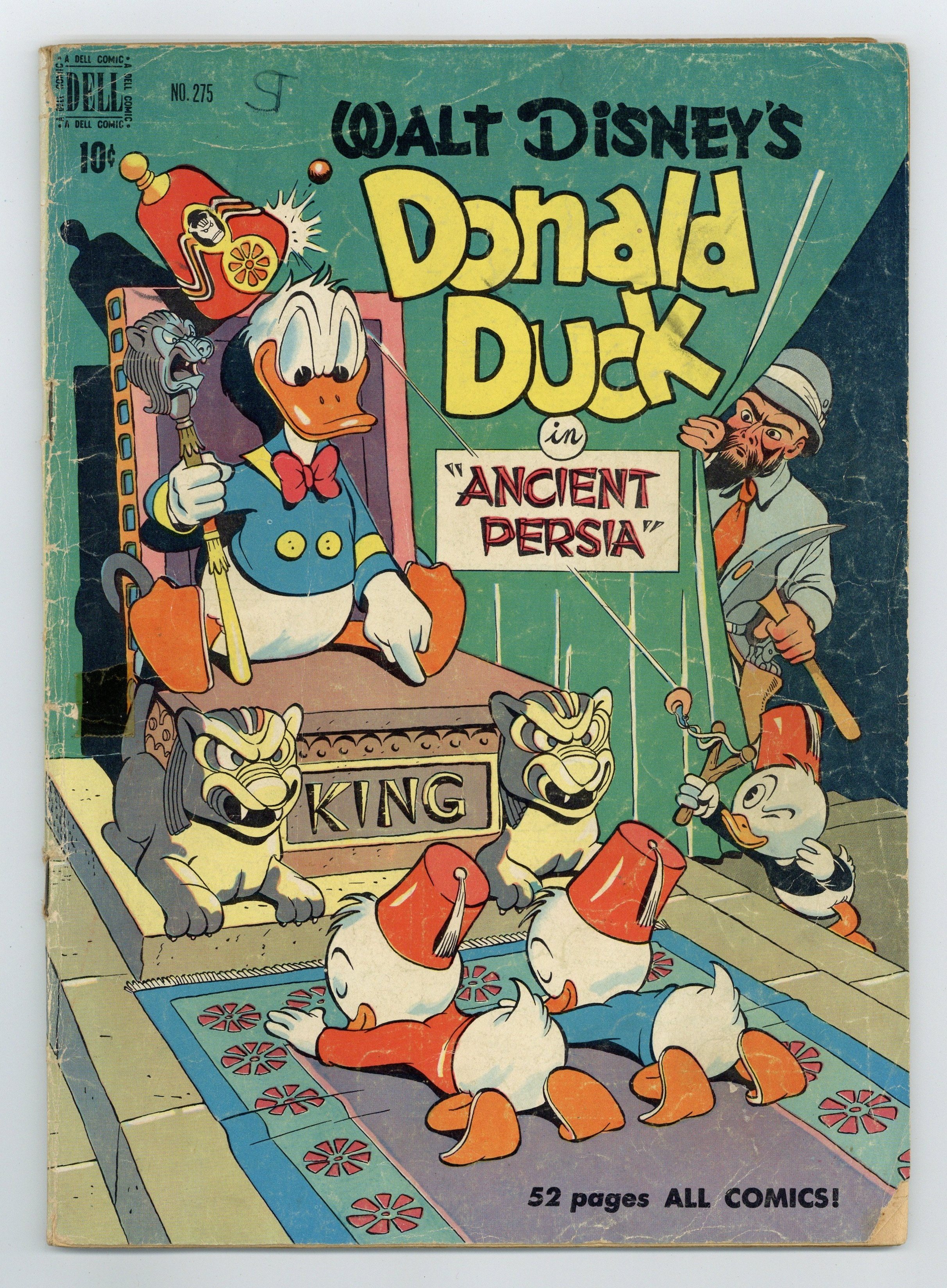 Indicia title is "Walt Disney's DONALD DUCK in ANCIENT PERSIA, No. 275." Cover art by Carl Barks. Donald Duck in Ancient Persia, script and art by Carl Barks; The ducks are kidnapped by a mysterious scientist and flown to Persia, where they dig into an ancient city, Itsa Faka. Jet-Job Joes, art by Paul Murry; The nephews want to enter their racer in a race, but Donald doesn't want them to go very fast. Rules 'n' Regulations, art by Paul Murry; Tired of the nephews messing up the house, Donald makes a set of rules that they have to follow; To escape the regulations, the nephews build a houseboat. 52 pages, full color. Cover price $0.10.