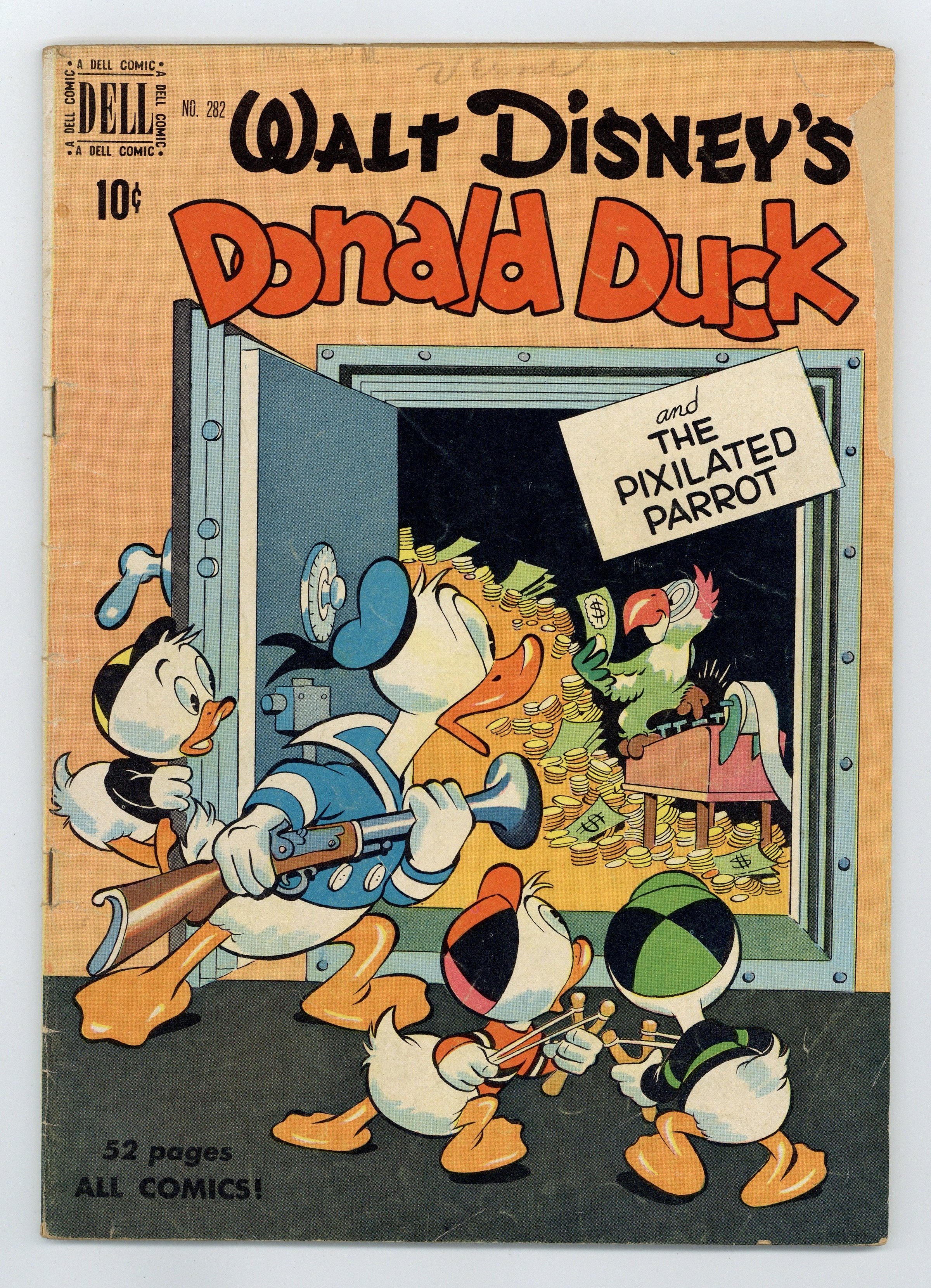 Indicia title is "Walt Disney's DONALD DUCK and the PIXILATED PARROT, No. 282." Cover art by Carl Barks. Donald Duck and "The Pixilated Parrot, script and art by Carl Barks; Donald gives Uncle Scrooge a parrot that only counts, instead of talking, and Scrooge has the parrot memorize the combination to his safe; which Scrooge has been forgetting. Pig in a Poke, pencils by Riley Thompson; Huey, Dewey, and Louis go to a farm to get an animal to show at the county fair. Fresh Milk and Eggs, art by Paul Murry; Donald is a milkman whose customers complain about not receiving fresh milk and eggs. 52 pages, full color. Cover price $0.10.