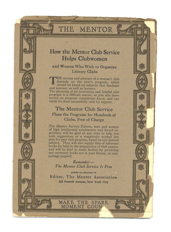 Published Nov 1917 by Mentor Association.$5.00- Spine split 90%. Cover Detached. Staple rust: Slight.