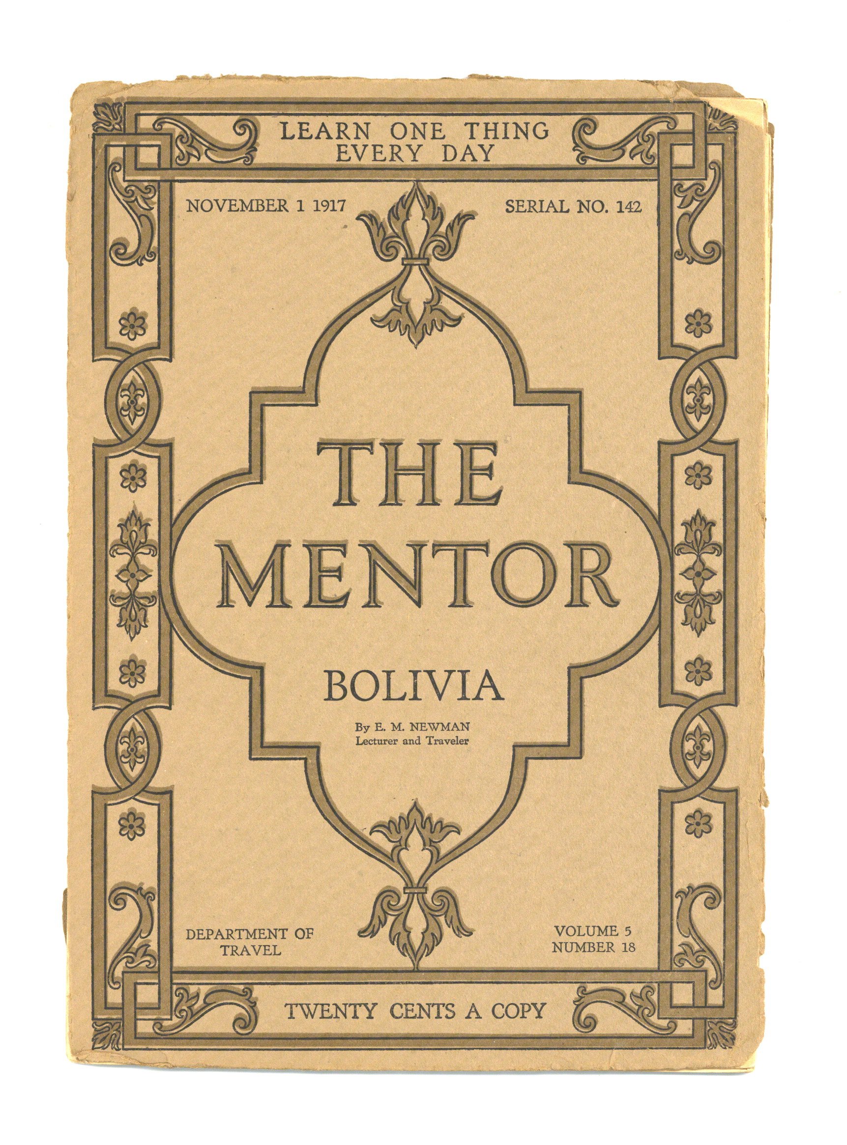 Published Nov 1917 by Mentor Association.$2.65Volume 5, Issue 18 (Whole Number 142) - November 1, 1917. In this issue: "Bolivia" by E.M. Newman. 7-in. x 10-in.; black and white; 12 pages on white paper plus card-stock covers. Cover price $0.20.
