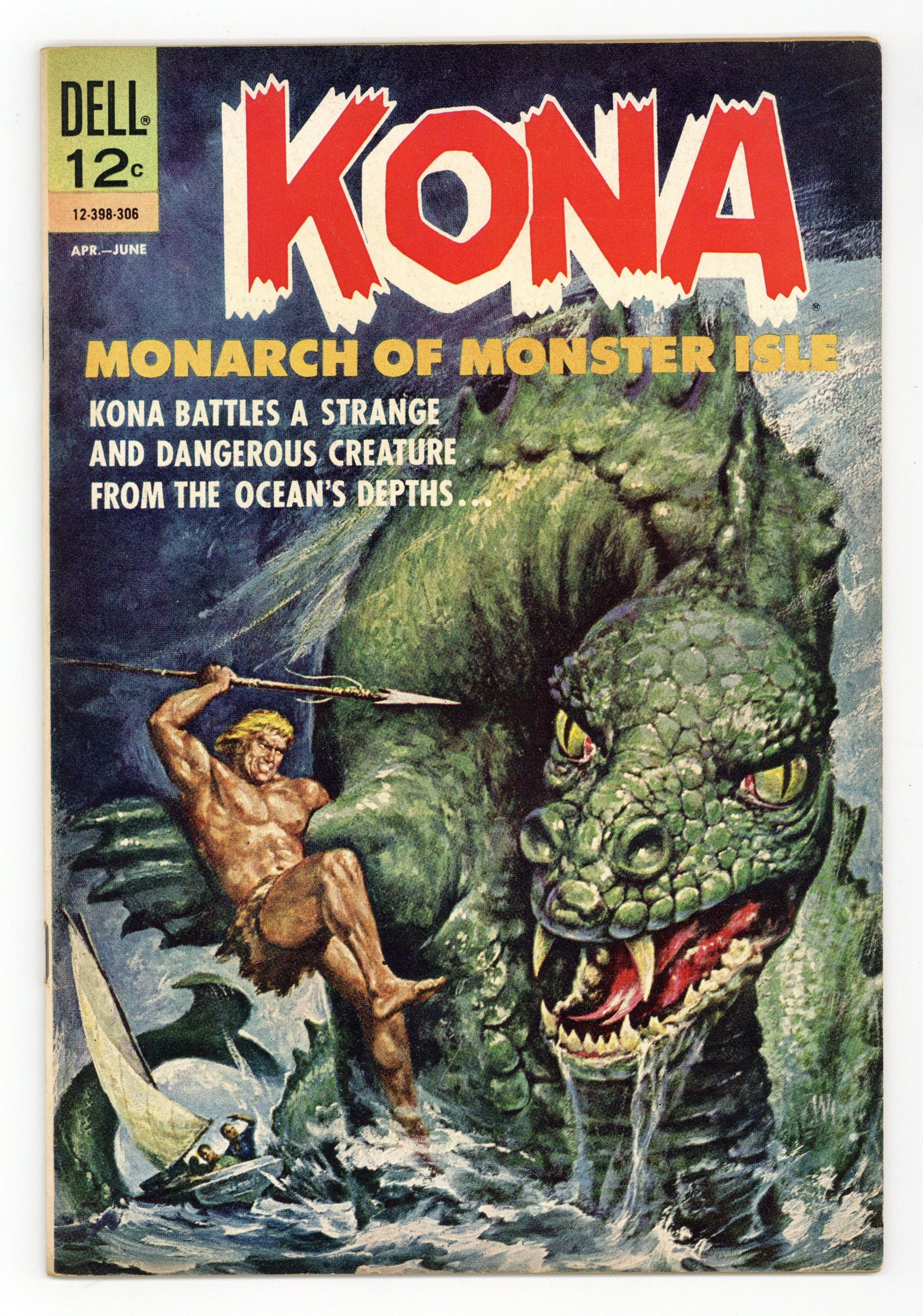 Stories and art by Sam Glanzman and Don Segall. Primitive warrior Kona tries to protect the Dodd family from the dinosaurs and gigantic creatures that populate Monster Isle. While Kona and the Dodd family are lost at sea, they encounter the Dragon from the Depths. In the underwater kingdom of Pacificus, they learn its extraterrestrial origins. There is a menace that only they can defeat to save the kingdom, as foretold by the Pacifican prophets. Anak enacts a desperate plan to drive away a dangerous horde of beetles. Plus history and mythology about Atlantis and the Tower of Babel. Best painted dinosaur cover yet, possibly by Vic Prezio. Kona; Atlantis; Anak. 32 pages, Full Color. Cover price $0.12.