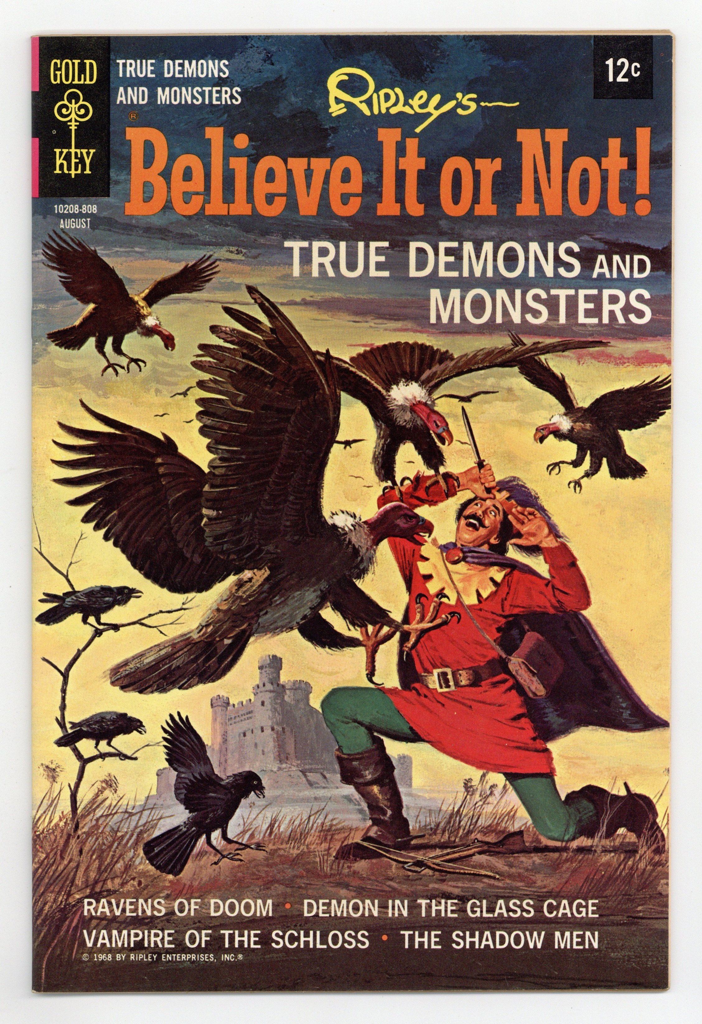 George Evans art (2 stories). Last 12c cover-priced issue. #10, 8/68 12c. Anthology type comic with suspense/mystery stories. Issue features "The Ravens of Doom," "The Vampire of the Schloss," "The Demon in the Glass Cage," and "The Shadow Men." Issue also has one-page text feature "The Thing at Loch Ness" and Gold Key Comics Club features. Number/month on Cover: 10208-808, August. Cover price $0.12.