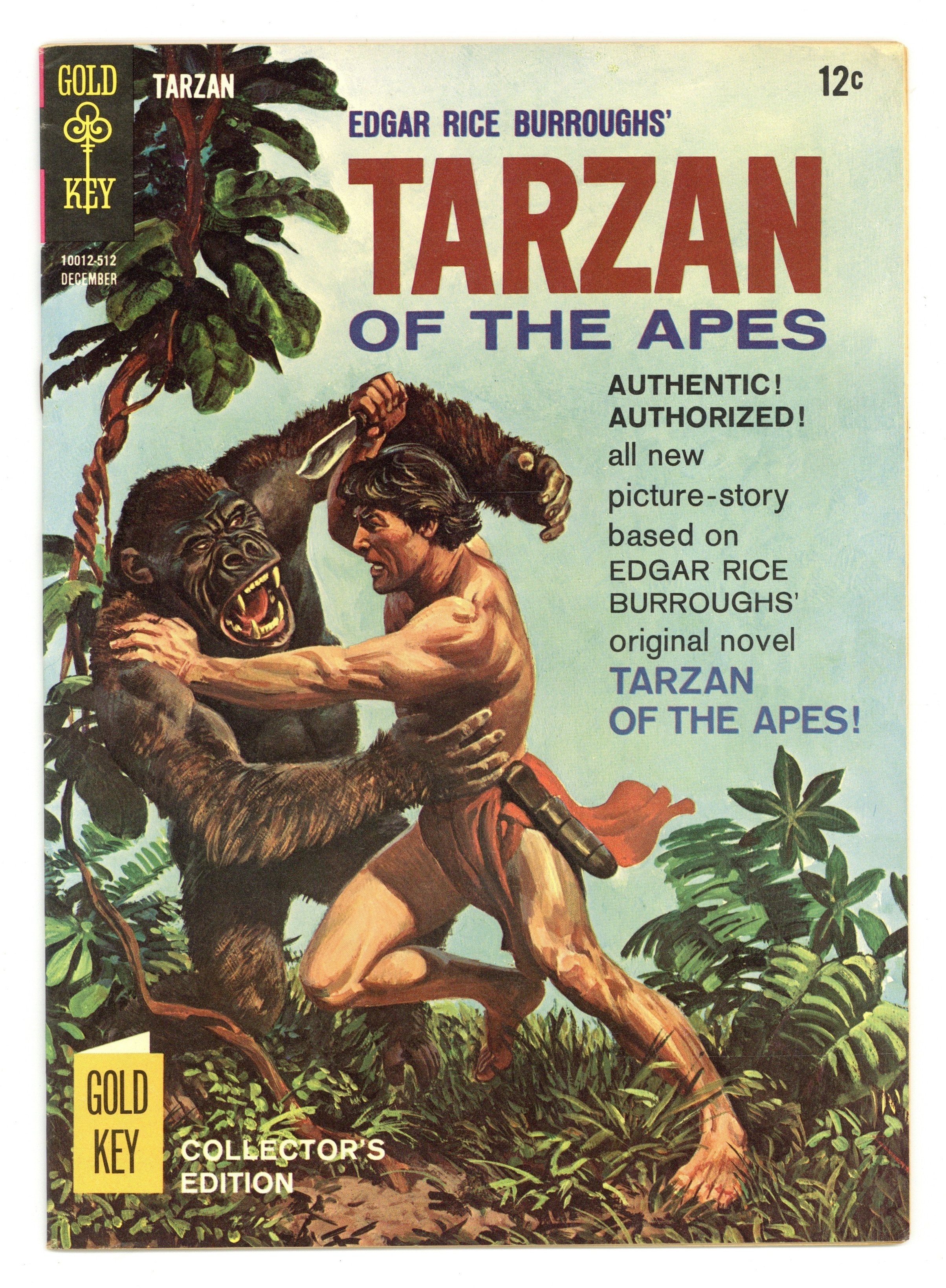 Published Dec 1965 by Dell/Gold Key.$18.00Painted cover art by George Wilson. "Tarzan of the Apes," script by Edgar Rice Burroughs (original novel) and Gaylord Du Bois (adaptation), art by Russ Manning and Mike Royer (art assistance); Kala the she-ape adopts a human infant whose parents have just died, and he grows to become Tarzan—a thinking man, with the physical skills of an ape; When mutineers maroon Jane Porter and her party he falls in love with Jane from afar, and places them under his protection against man, beast, and the elements. The Return of Tarzan comic ad. "A Strange Custom" text story starring Mabu, art by Nat Edson. "Vanished," script by Gaylord Du Bois, art by Russ Manning; Mutwanda is kidnapped, but he is rescued by Shala. Article on Tarzana, Ca. with photo of Russ Manning and Hulbert Burroughs. Number on cover 10012-512 December. 36 pages, full color. Cover price $0.12.