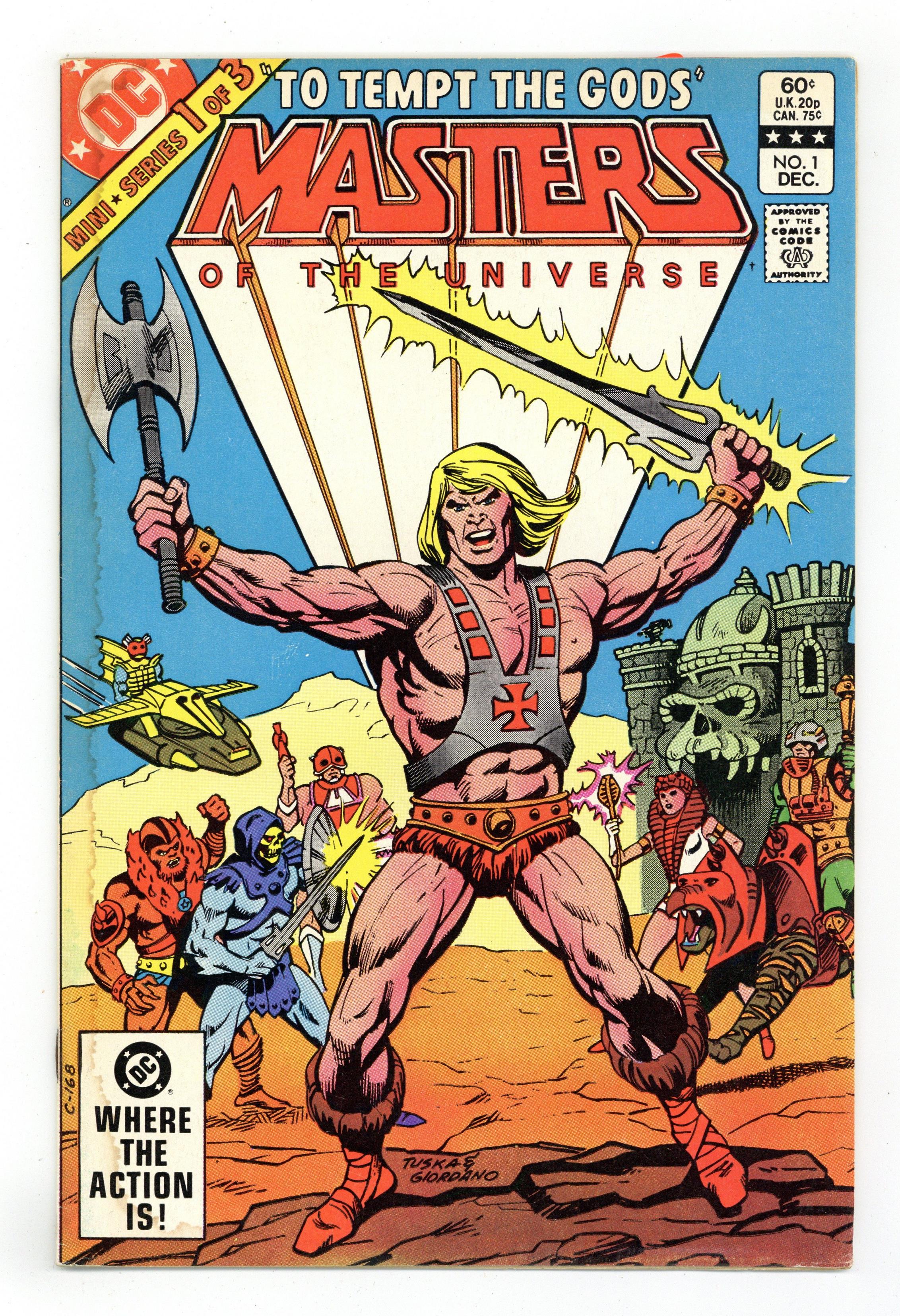 Direct Edition. 'To Tempt the Gods!' Written by Paul Kupperberg. Art by George Tuska and Alfredo Alcala. Cover by George Tuska and Dick Giordano. He-Man…Battle-Cat…Man-At-Arms…Teela…Stratos… They are among the mightiest heroes on a world where science and magic meld to form a realm undreamed of. They fight a never-ending battle against the dark warlock Skeletor and his vicious horde of mutants and sorcerers. They fight for the power of Castle Grayskull, an ancient citadel that stands at the apex of time and space. For who should ever hold the power will truly be the Masters of the Universe! 32 pages, FC. Cover price $0.60.