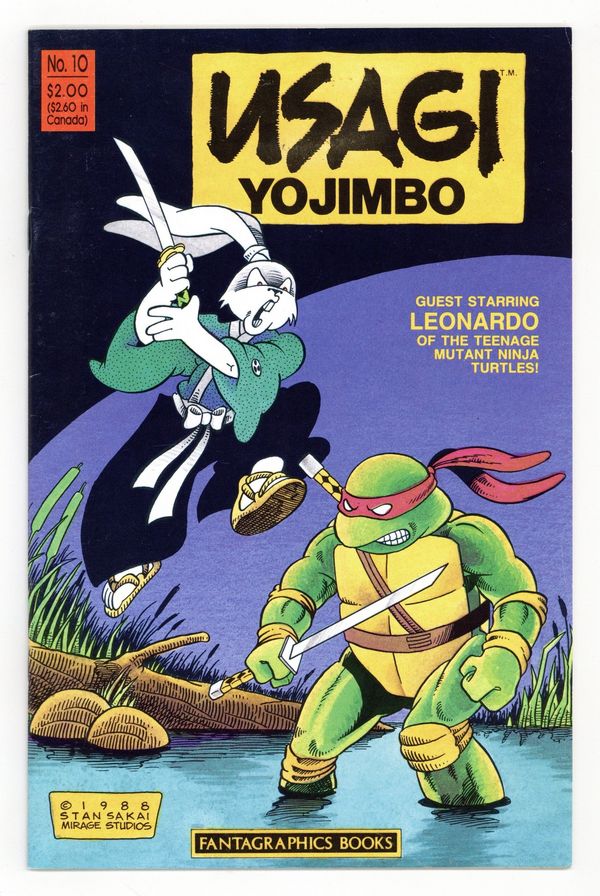 2nd or later printing. Usagi encounters the enigmatic Jei, who is either a religious visionary or a dangerous lunatic; story, art and cover by Stan Sakai. Then, Usagi meets the Teenage Mutant Ninja Turtles, in a story by TMNT creator Peter Laird. Black and white; 32 pages. Teenage Mutant Ninja Turtles crossover. Other titles featuring Usagi Yojimbo include Albedo, Doomsday Squad #3 and Space Usagi. NOTE: Some issues from #1-10 were reprinted. Reprints are so noted in the reprint edition's indica. Cover price $2.00.