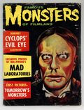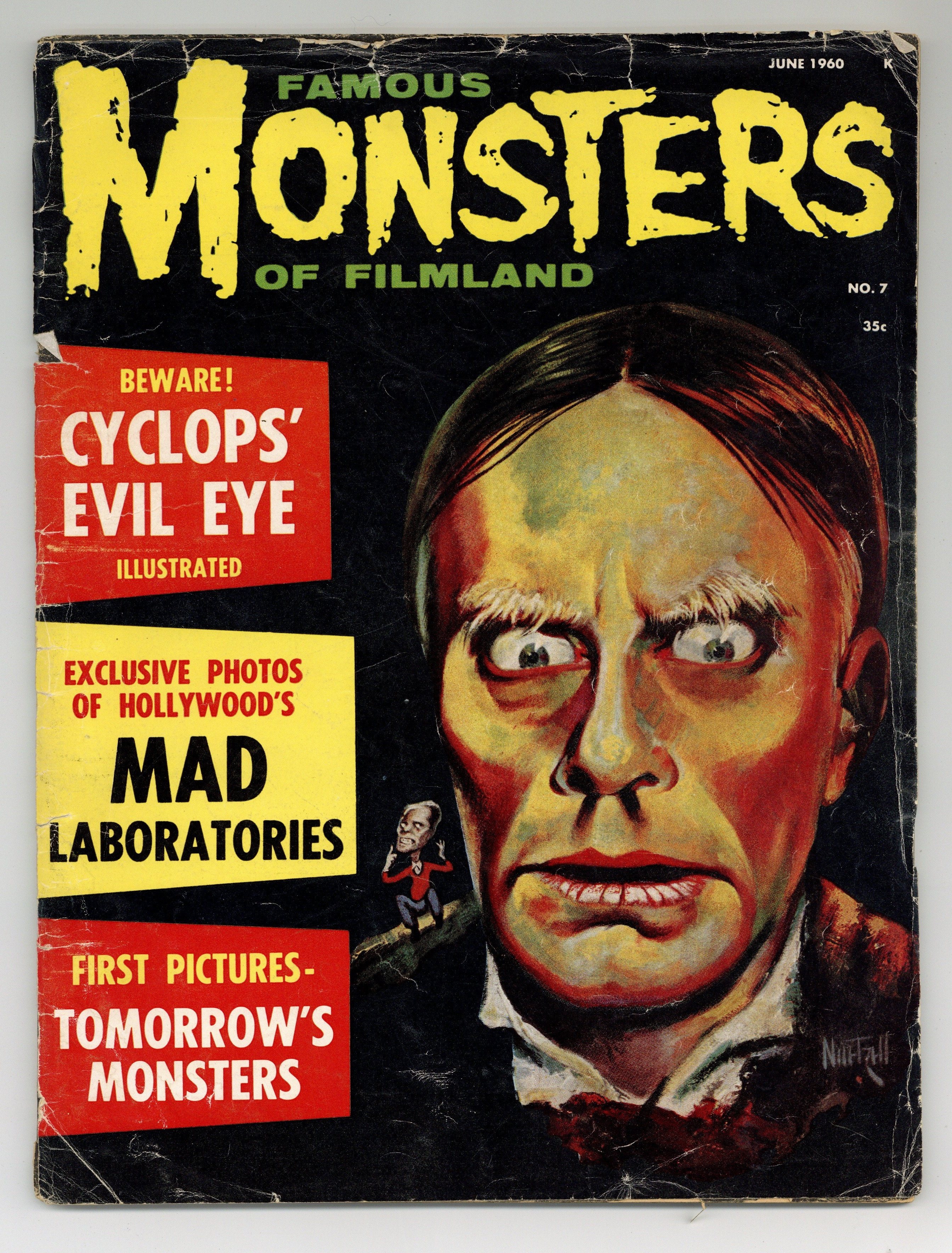 First issue marked "Collector's Edition" on cover. Features in this issue include: "Dear Monster" (which includes a letter by future genre expert Bill Warren); a preview and plot synopsis of Dr. Cyclops; "Mad Labs" (pictures of mad doctors in their labs); and more. There's a photo inside of Editor Forrest J Ackerman with Nancy Reagan (who starred in Dr. Cyclops). Painted cover by Albert Nuetzell is of television horror host Zacherley. Between 100-200 copies of Famous Monsters of Filmland #7 had a "Lucky 7" Stamp near the spine in the margin. This page could be torn out and sent in to Warren Publishing to receive free copies of the magazine for life. 68 pages, B&W. Cover price $0.35.