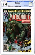 Direct Edition. While hiding in the Everglades, Steve Coffin and the Micronauts are attacked by the Man-Thing, and Baron Karza learns of the existence of Earth and travels through the Prometheus Pit to Earth in "Adventure into Fear!" Characters: Micronauts [Commander Arcturus Rann; Marionette [Princess Mari]; Acroyear; Bug; Microtron; Biotron]; Steve Coffin; Dallan Rann (Flashback); Lady Sepsis (Flashback); Baron Karza; Time Traveler; Man-Thing [Ted Sallis]; Professor Prometheus; Prince Argon; Slug; Shadow Priests; Dog Soldiers; Ray Coffin; Endeavor (Rann's spaceship); The Prometheus Pit. Written by Bill Mantlo and Michael Golden, with art by Michael Golden and Joe Rubinstein. Cover by Michael Golden and Neal Adams. Cover price $0.40.