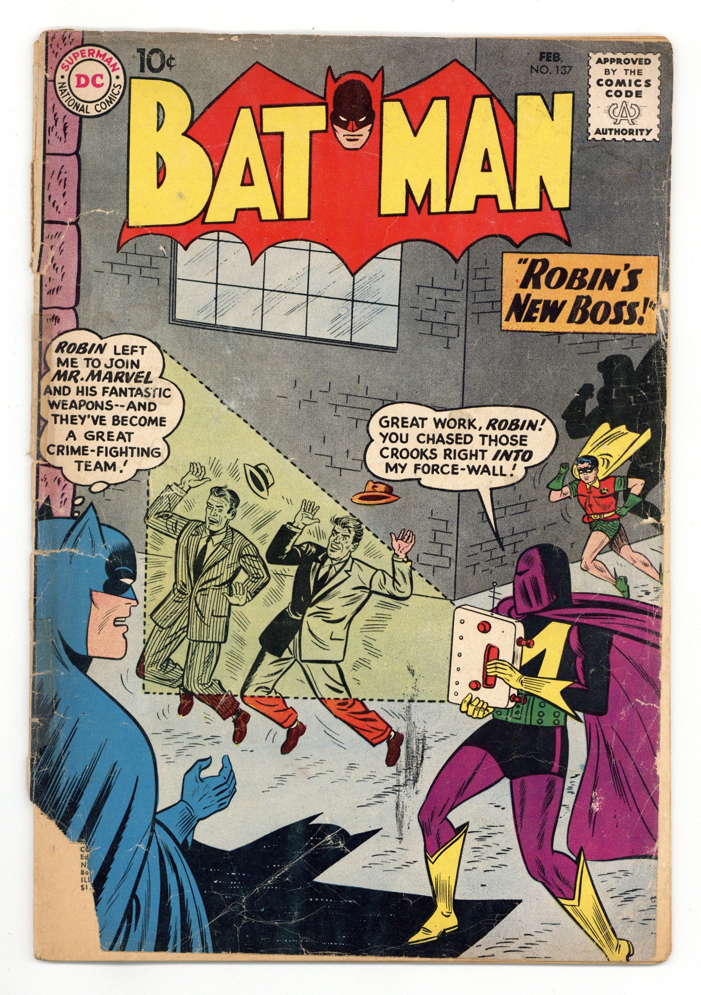 Starts May 25 Cover by Sheldon Moldoff. "Robin's New Boss," script by Bill Finger, pencils by Sheldon Moldoff, inks by Charles Paris; Robin informs Batman that he is quitting the team to join up with a new crime fighter on the scene, Mr. Marvel, although Batman doesn't suspect the real reason why. Our American Heritage public service announcement, art by Bernard Baily. "The Bandit with 1,000 Brands," script by Bill Finger, art by Sheldon Moldoff; Batman faces a clever new foe that leaves cattle brands behind as clues. One-page Jail Jests story by Henry Boltinoff. "Teacher from the Stars," script by Bill Finger, pencils by Sheldon Moldoff, inks by Charles Paris; Batman agrees to give an alien teacher and his students a tour of Gotham City, but when they begin to misbehave, it causes more than just a headache for the Caped Crusader. Statement of ownership; average sales 502,000. 36 Pages, Full Color. Cover price $0.10.