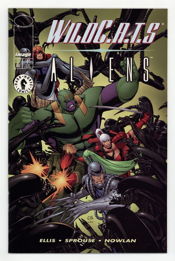 Written by Warren Ellis. Art and cover by Chris Sprouse and Kevin Nowlan. When an escape pod crash-lands on New York with injured StormWatch agent Flint enclosed, the WildC.A.T.s decide to get involved. Void teleports the team up to SkyWatch and into the middle of a disaster zone. They discover two things; for one, the aliens arent Daemonite and two, they are going to have one hell of a time getting the survivors, and themselves, off the space station alive. But how can even the WildC.A.T.s survive an encounter with the Aliens when StormWatch has already fallen. Get ready for a horror/sci-fi/super hero slugfest the likes that has never been seen before! Story concludes in StormWatch (1997 2nd Series) #11. 48 pages, FC. Cover price $4.95.