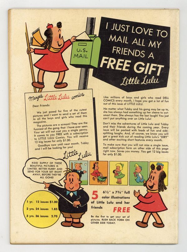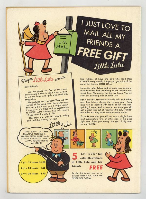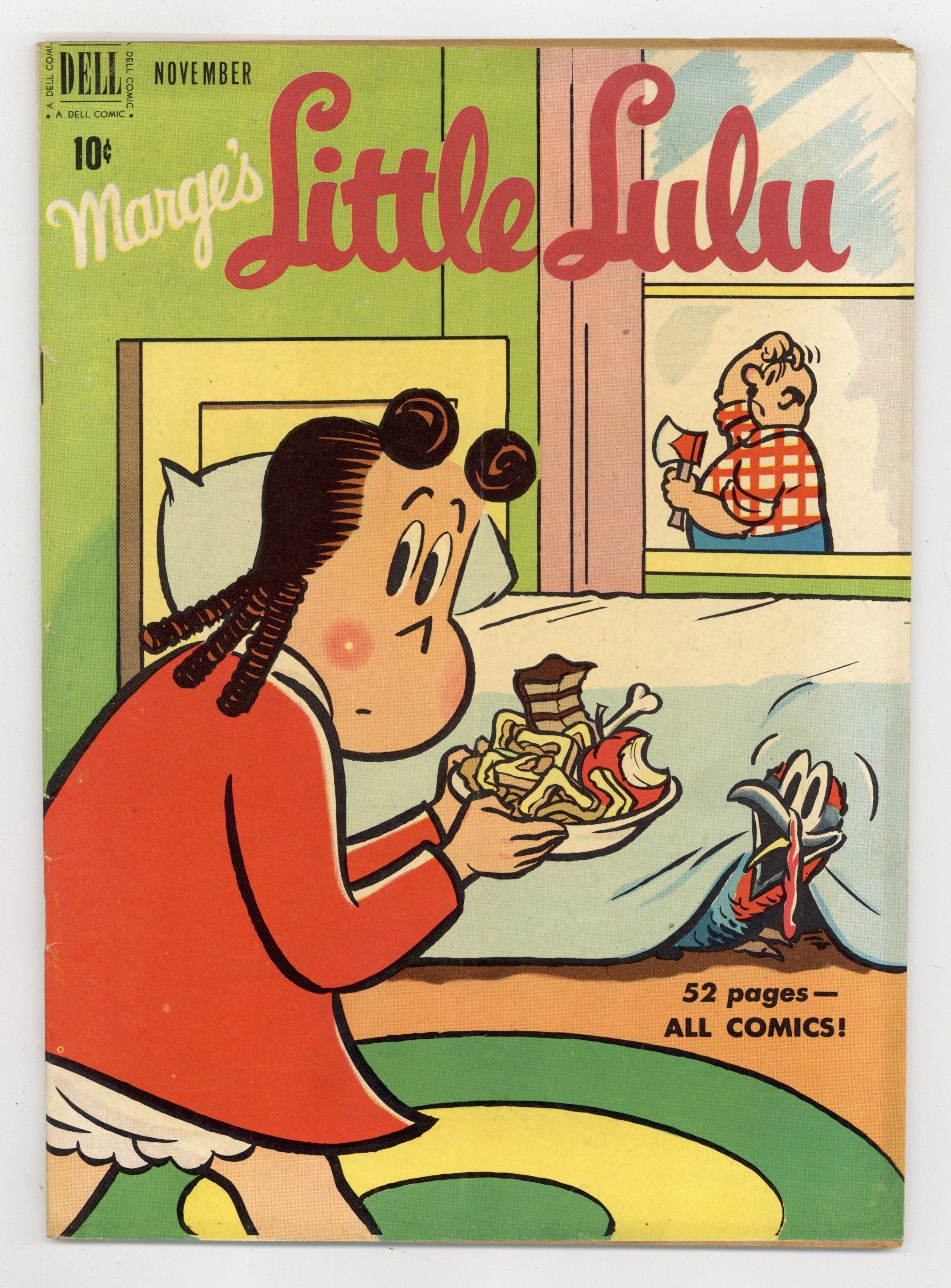 Cover art by Irving Tripp. Lucky Lulu; Lulu wins a turkey in a raffle but doesn't want to eat it for Thanksgiving. Little Lulu; Lulu tricks the boys into raking the leaves off her lawn. In Nothingland; Lulu tells Alvin about the little girl who didn't like anything and wanted to go to Nothingland. Cousin Pete; Tubby doesn't want to take his cousin Pete to the clubhouse. Alvin humor page. All scripts by John Stanley, art by Irving Tripp. Two-page text story, Lulus Diry ("Diary"). Back cover has advertisement for five color Little Lulu pinups. 52 pages, full color. Cover price $0.10.