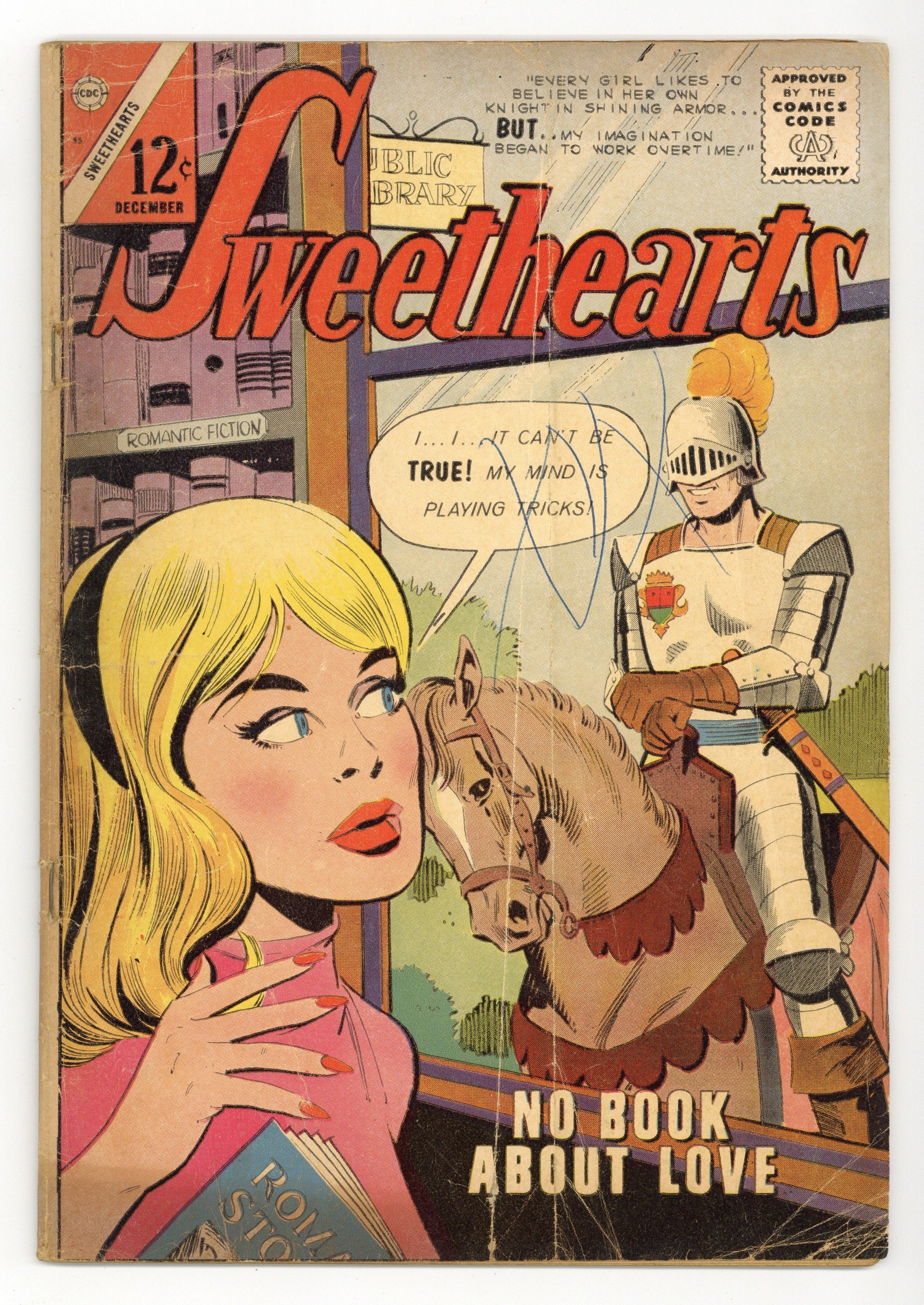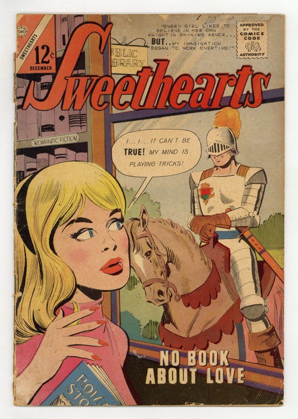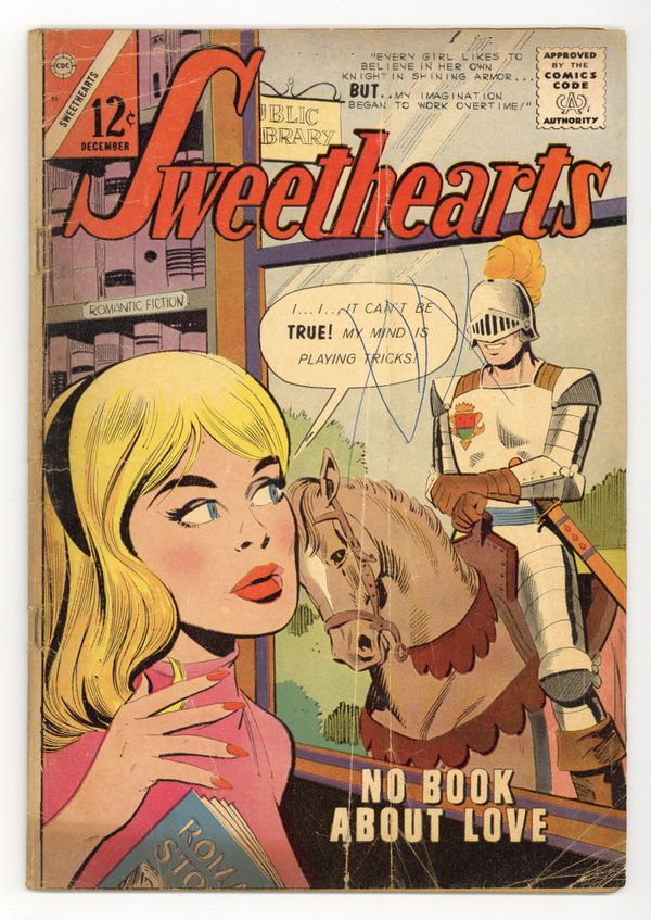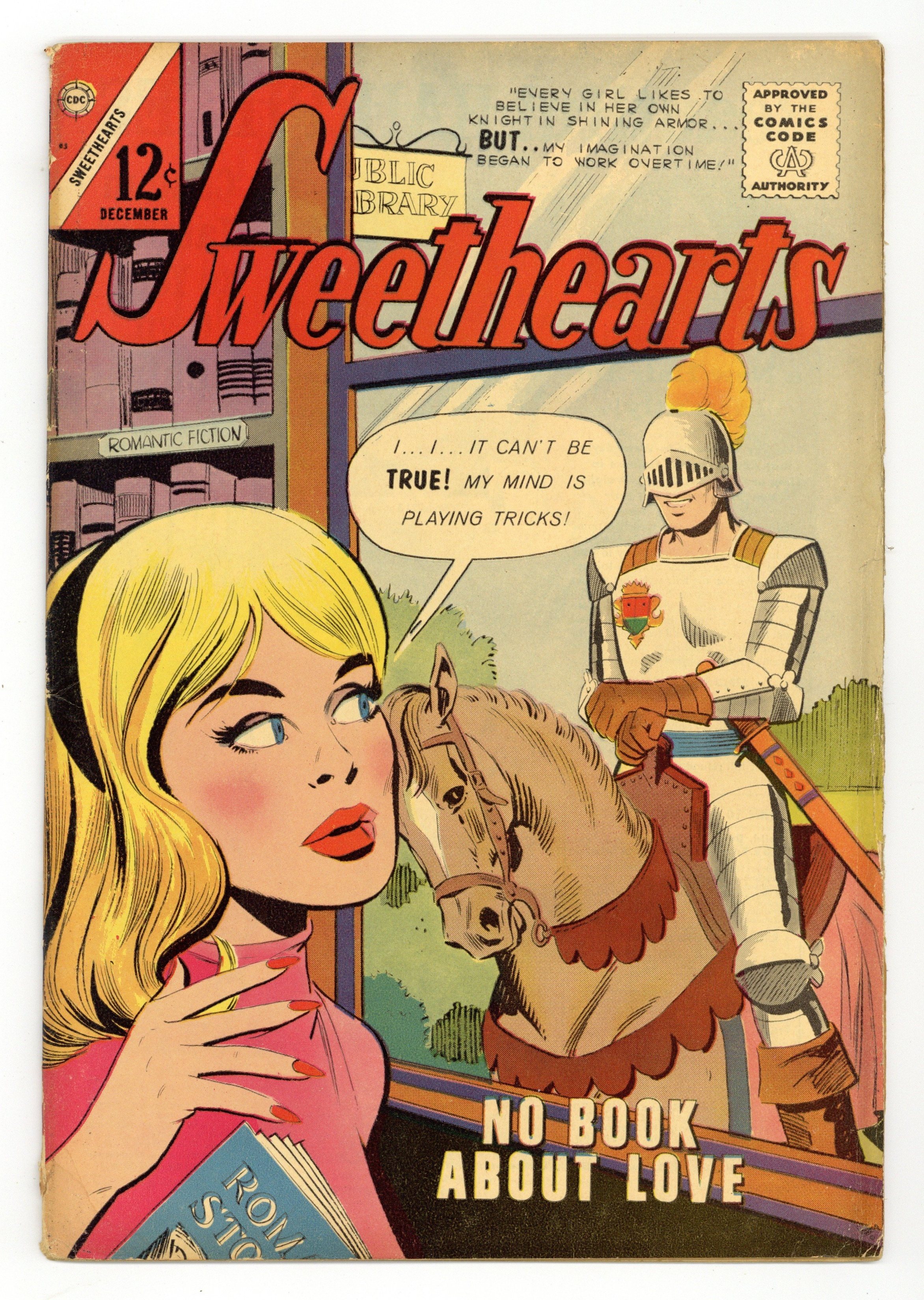 Published Dec 1965 by Charlton Comics Group.$23.00Cover inks by Dick Giordano. Stories and art by Bill Molno and others. Sweethearts was Charlton's continuation of the first monthly romance title, lasting from the romance boom of the '50s until the early '70s. Redheaded dancing instructor Vera used to love her job, but now it just reminds her of Rick, the former student who swept her off her feet. Librarian Kim longs to meet a man who can measure up to the romantic heroes of her favorite books. Longtime rivals Dina and Greg are stranded in the wilderness, and must work together to survive. The Love Waltz; Come Home; No Book About Love; From Hate to Love. 32 pages, Full Color. Cover price $0.12.