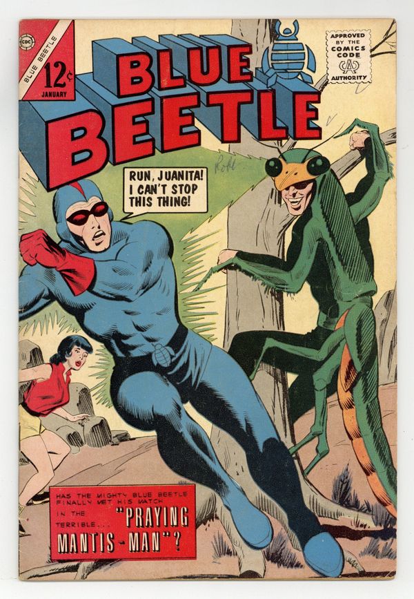 Cover by Dick Giordano. Stories and art by Joe Sinnott, Pat Masulli, Joe Gill, Bill Fraccio and Tony Tallarico. The second Charlton series to feature Dan Garrett, the Golden Age Blue Beetle. After every other insect in the animal kingdom (including beetles and ticks) has inspired a superhero or villain, it was only a matter of time before the arrival of...Praying Mantis-Man. The backup stories include a science-fiction yarn with early art by future Fantastic Four legend Joe Sinnott, and a Blue Beetle pin-up by Pat Masulli. The Praying Mantis-Man; The Silent World; The Outpost. 32 pages, Full Color. Cover price $0.12.