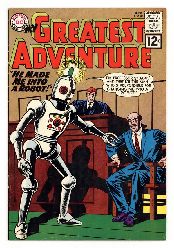 $19.75Cover pencils by Dick Dillin, inks by Sheldon Moldoff. I Dueled with Super Spirits, art by Howard Sherman; An explorer encounters two legendary spirits who are locked in eternal combat. Peter Puptent Explorer humor page by Henry Boltinoff. Ad for Superboy #96 and Superman #152, pencils by Curt Swan, inks by Sheldon Moldoff and George Klein. I Starred in an Alien Movie!, art by Howard Purcell; An actor is enlisted by aliens to make a movie playing a powerful invader, but the aliens are really planning to frame him for conquering their planet. Ad for Showcase #37 (first Metal Men), pencils by Ross Andru, inks by Mike Esposito. He Made Me into a Robot, art by Bill Ely; Professor Joshua Stuart is tricked by Professor Reynolds into having his brain temporarily transferred into a robot body, but Reynolds then refuses to switch Stuart's brain back to his body as the time runs out for his survival. 36 Pages, Full Color. Cover price $0.12.