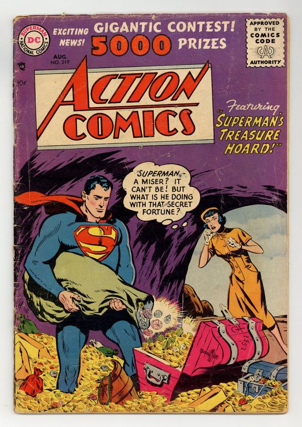 Cover pencils by Wayne Boring, inks by Stan Kaye. "Superman's Treasure Hoard," script by Bill Finger, pencils by Wayne Boring, inks by Stan Kaye; Superman is accumulating incredible wealth in a cavern of his own making, but no one seems to know the reason why. "The Amazing Army of Apes," script by Jack Miller, art by Ed Smalle; A military officer appears to go crazy and starts to think apes are his soldiers. 3/4–page Shorty story by Henry Boltinoff. "The Day I Beat the Baseball Jinx," script by Jack Miller (as Jack Mason), art by Raymond Perry. "Tom Thumb Tommy Tomorrow," script by Otto Binder, art by Jim Mooney. 36 Pages, Full Color. $.10 Cover price $0.10.