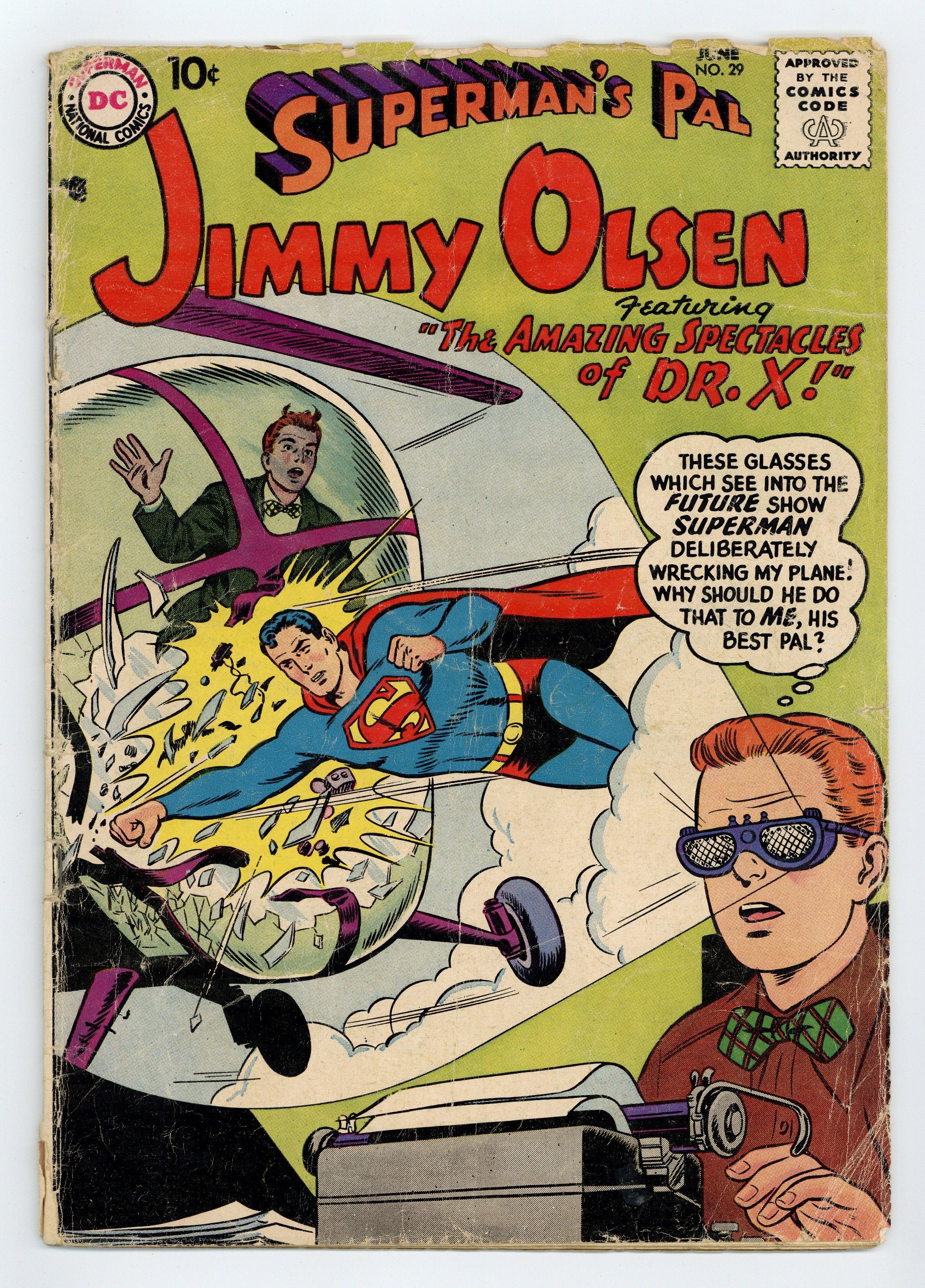 Cover pencils by Curt Swan, inks by Stan Kaye. The Superman Book That Couldn't Be Finished; Jimmy writes a book about his and Superman's adventures. Jimmy Olsen's Super Pet; Krypto turns up in Metropolis after years in space but is now old. The Amazing Spectacles of Doctor "X"; Jimmy dons glasses that let him see the future. Scripts by Otto Binder, pencils by Curt Swan, inks by Ray Burnley. Little Pete humor page by Henry Boltinoff. 36 Pages, Full Color. Cover price $0.10.