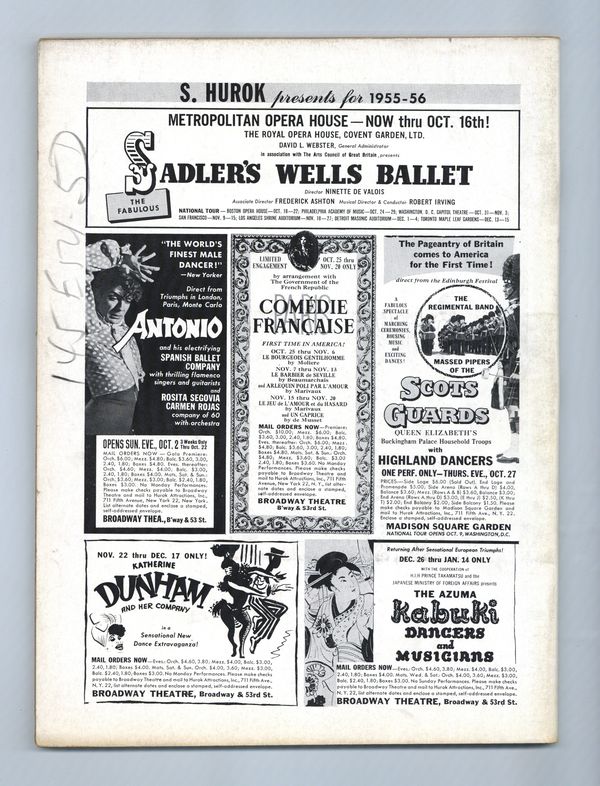 Published Oct 1955 by Theatre Arts, Inc..$70.00Theatre Arts is legendary for its thorough and insightful coverage of the stage, both in American and England. Less well-known is the fact that TAM also provided some outstanding coverage of motion pictures, Broadway and Hollywood. 8.5" x 11", 100 pages, B&W with spot color. Cover price $0.50.