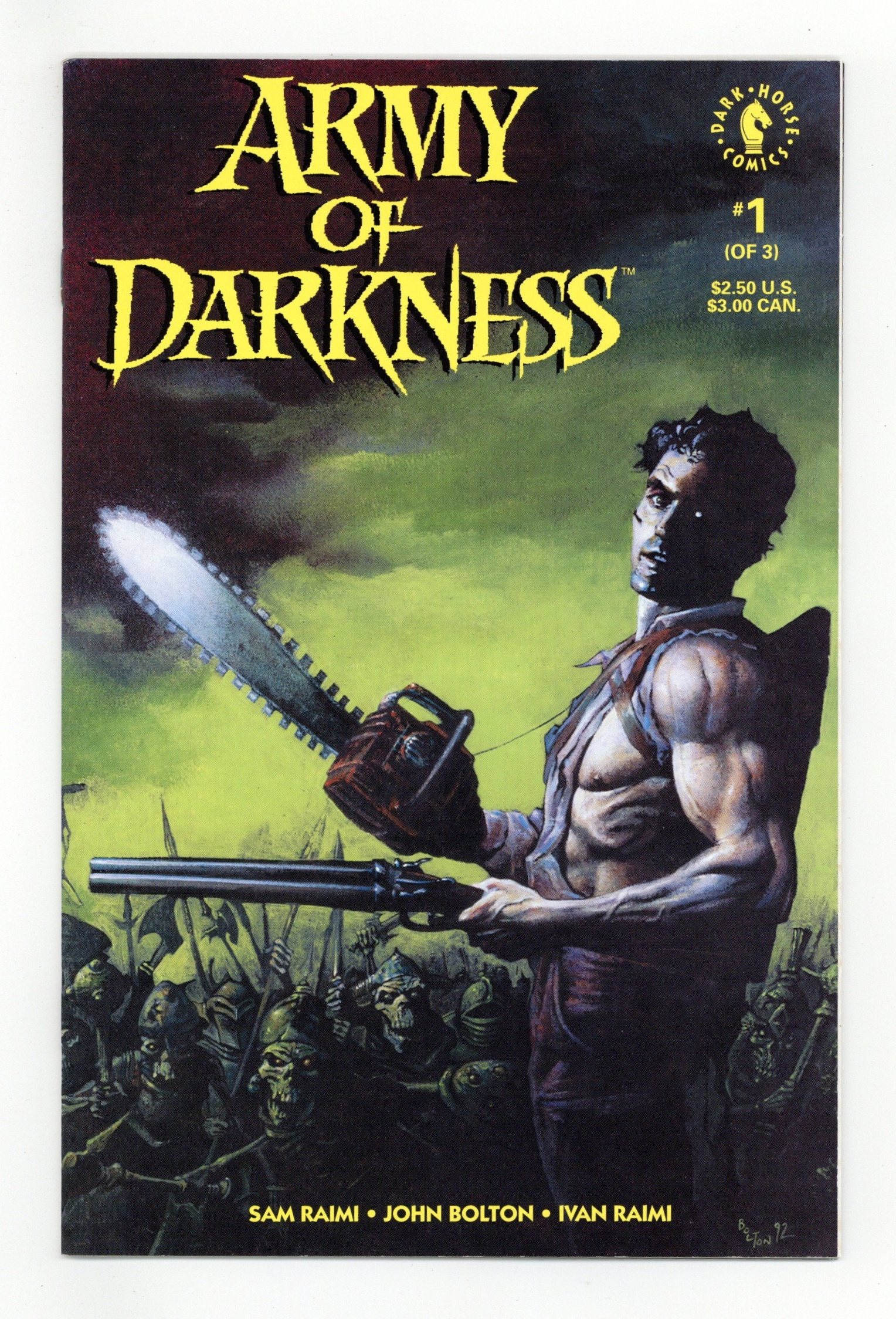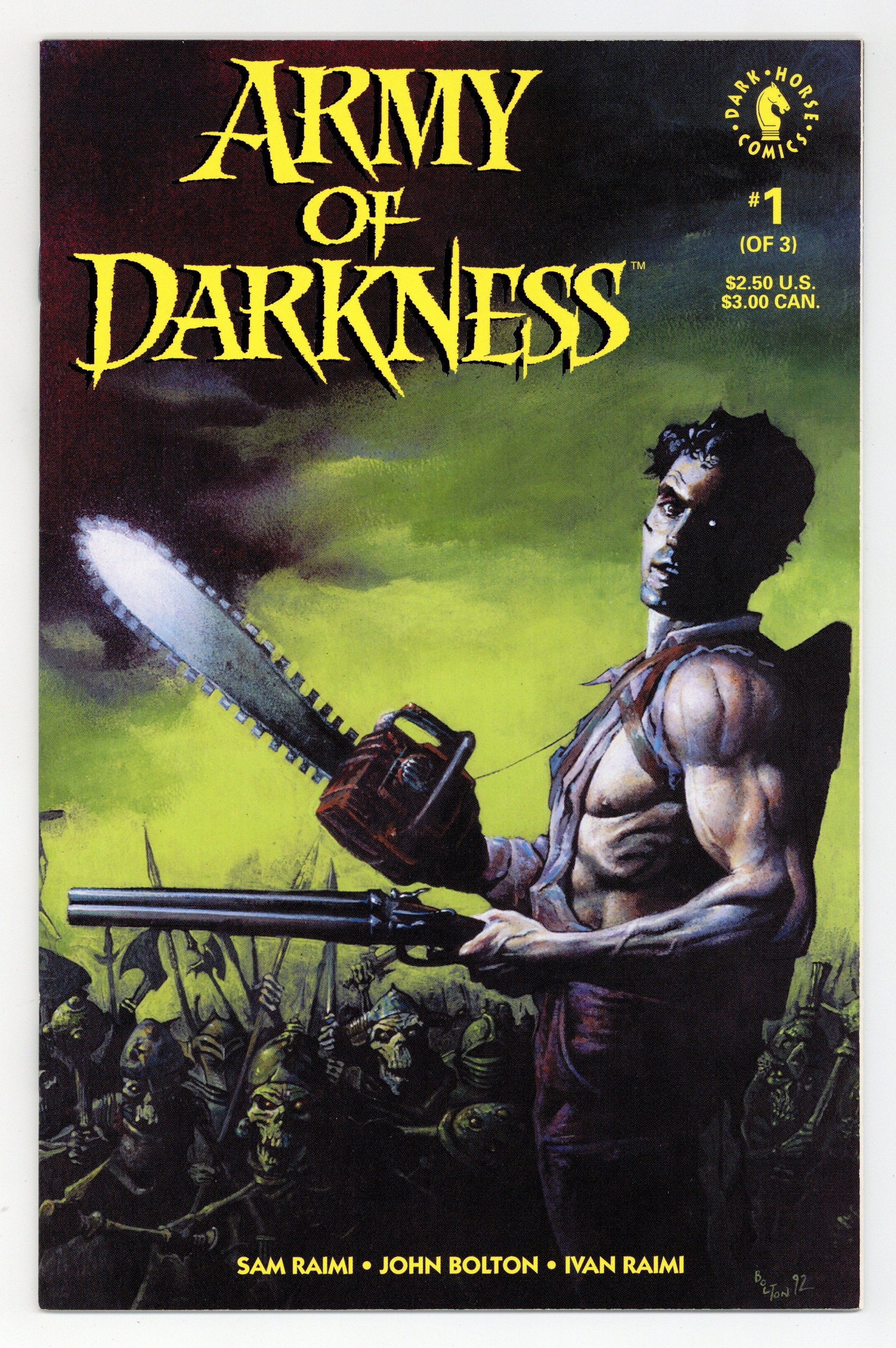 Published Nov 1992 by Dark Horse.$40.00Written by Sam Raimi and Ivan Raimi. Art and cover by John Bolton. "Who's laughing now?" Not Ash, the hero of Sam Raimi's cult-classic film Evil Dead II. Armed with his chainsaw and shotgun, Ash finds himself stranded in the Middle Ages battling the resurrected armies of the dead! 32 pages, FC. Cover price $2.50.