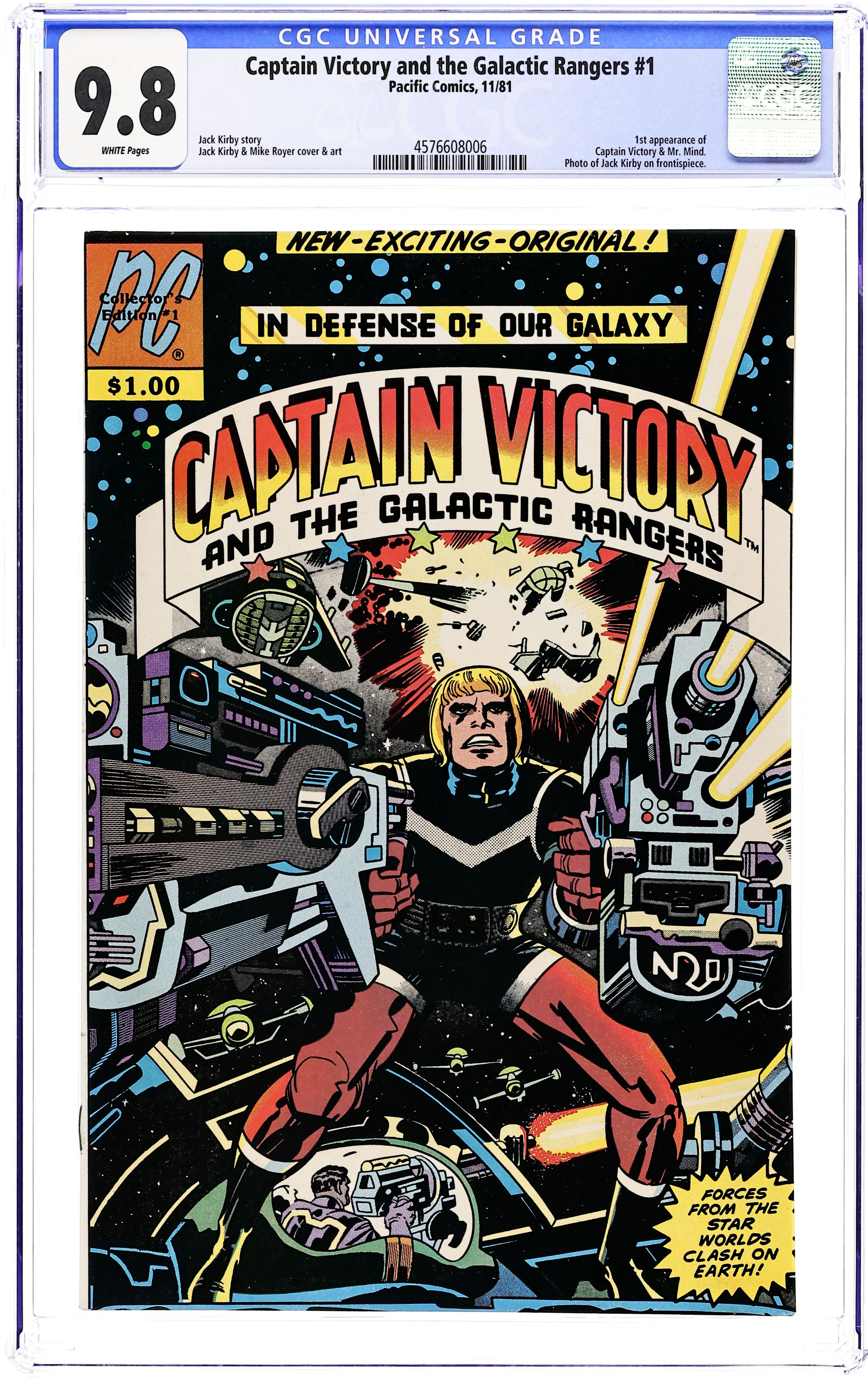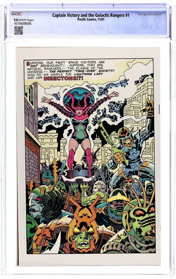Stories by Jack Kirby. Art by Jack Kirby, Mike Royer and Mike Thibodeaux. Cover by Jack Kirby and Mike Royer. One of the final series from legendary artist Jack Kirby. Interstellar law officer Captain Victory battles menaces from space such as the Insectons, replacing his body with a fresh clone whenever it gets badly damaged. This series launched both Pacific Comics and the independent, creator-owned trend in comics publishing. Captain Victory and the Galactic Rangers pursue Lightning Lady, queen of the Insectons, to her refuge on Earth. Jack "King" Kirby; Captain Victory and His Galactic Rangers; Small Arms in the Galactic Arsenal; Special Section Troops; Cast of characters; Galactic Military Insignias; Lightning Lady and Her Insectons. 32 pages, Full Color. Cover price $1.00.