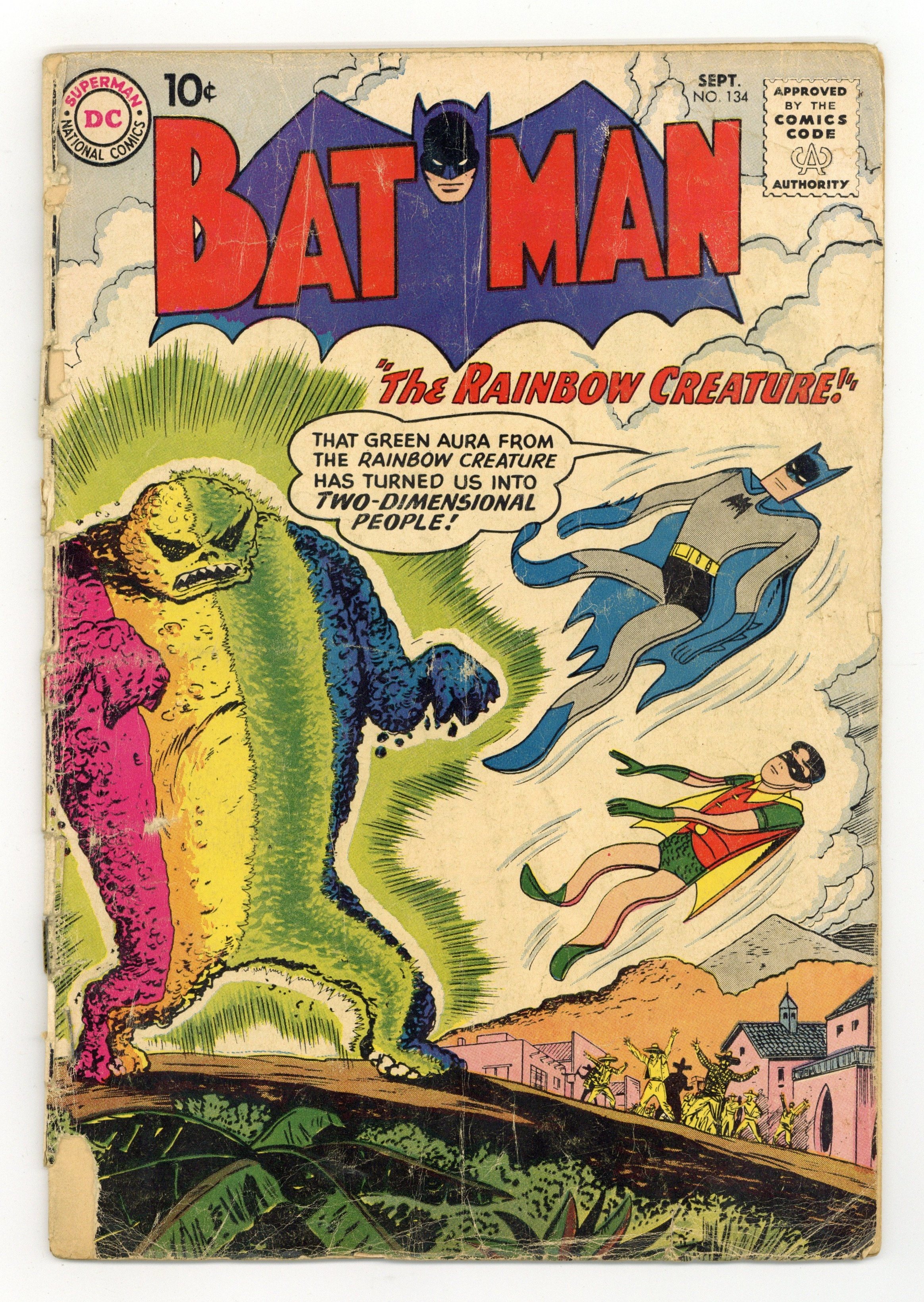 Cover by Sheldon Moldoff. "The Rainbow Creature," script by Bill Finger, art by Sheldon Moldoff; The Caped Crusaders, in South America to provide assistance to a leader, encounter a strange rainbow-colored creature that has emerged from a volcano. One-page Jail Jests story by Henry Boltinoff. Bike Safety = Bike Fun! public service announcement, art by Bernard Baily. "Batman's Secret Enemy," script by Bill Finger, art by Sheldon Moldoff; Bruce receives a very disturbing letter from someone, indicating that they know Batman's secret identity; The Caped Crusaders cature three crooks, believing any one of them may have written the letter. Half-page Casey the Cop story by Henry Boltinoff. "The Deadly Dummy," script by Bill Finger, pencils by Sheldon Moldoff, inks by Charles Paris; Hurt deeply by people making fun of him because of his size, Danny decides to turn to crime and runs into the Caped Crusaders. 36 Pages, Full Color. Cover price $0.10.