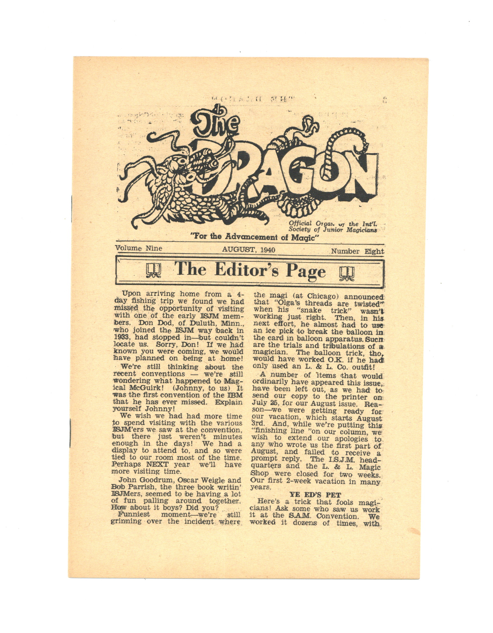 Published Aug 1940 by International Society of Junior Magicians.$19.00Official organ of the International Society of Junior Magicians, containing news and tips. 16 pages on newsprint.