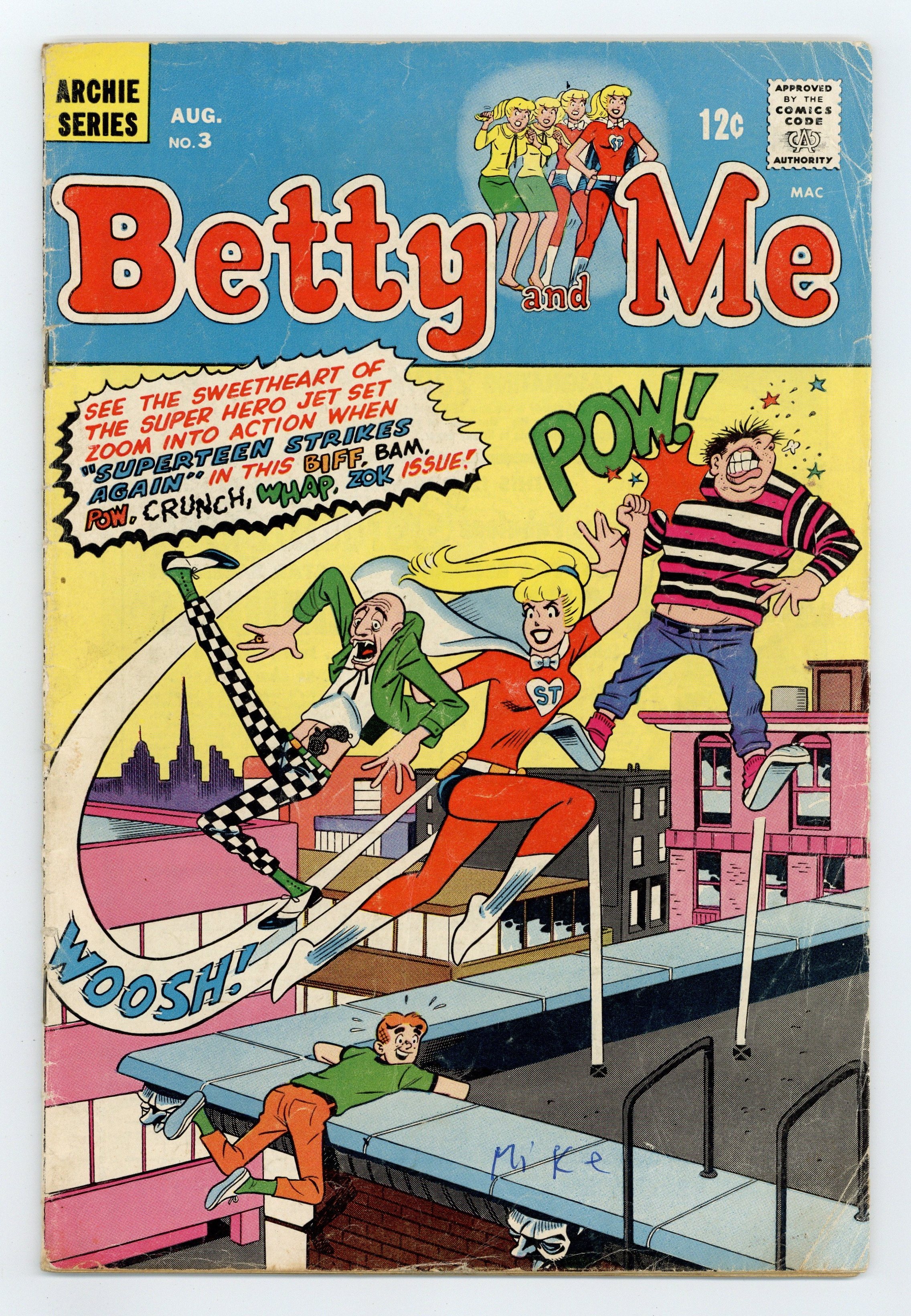 Cover pencils by Dan DeCarlo, inks by Vincent DeCarlo. "It All Began," script by Frank Doyle, pencils by Dan DeCarlo, inks by Vincent DeCarlo; While trapped on a ledge with Archie, Betty's hair gets twisted and she becomes Superteen. "Superteen Strikes Again," script by Frank Doyle, pencils by Dan DeCarlo, inks by Vincent DeCarlo; Superteen uses her powers to save Archie and Veronica from Communist spies. "Turnpike Terror," script by Frank Doyle, pencils by John Rosenberger, inks by Mario Acquaviva; Betty takes up motorcycling, then Veronica has to try to outdo her to attract Archie's attention. "Getting the Point" one-page Li'l Jinx story by Joe Edwards. 36 pgs. Cover price $0.12.