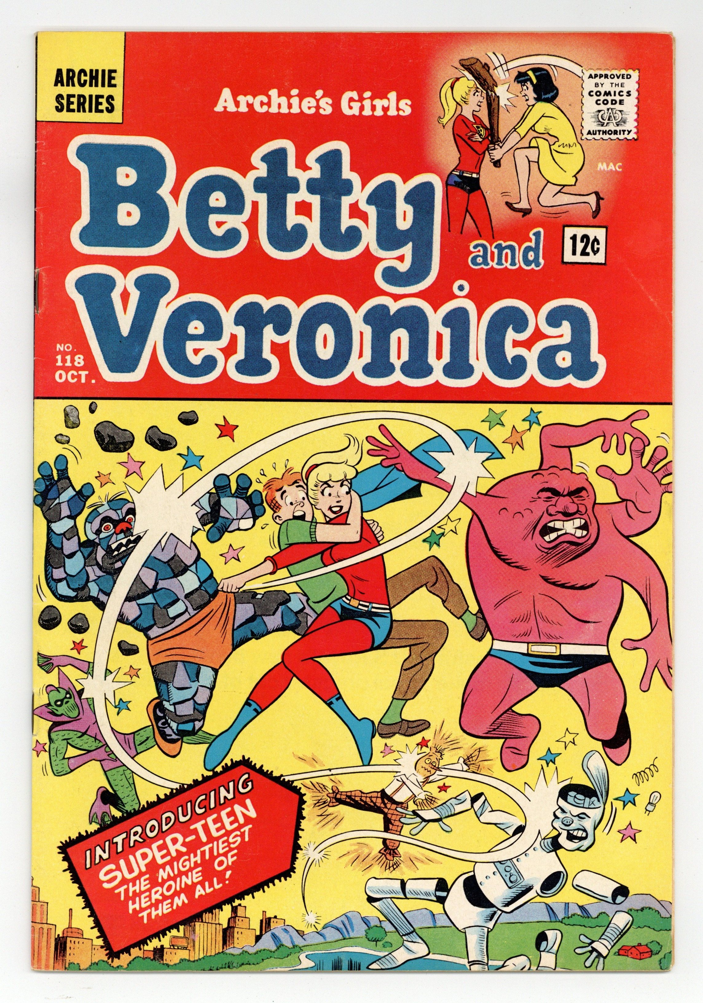 Cover pencils by Bob White, inks by Marty Epp. Just Imagine, script by Frank Doyle, pencils by Dan DeCarlo, inks by Vincent DeCarlo; Betty imagines that she's Superteen, a being with super powers who will protect Archie from the forces of evil and beat up Veronica. Veronica pinup, pencils by Dan DeCarlo, inks by Vincent DeCarlo. Vacation Blues, pencils by Dan DeCarlo, inks by Vincent DeCarlo; Every time Betty says she'd like a vacation with the ocean spray in her face, she gets splashed. Photogenius, pencils by Dan DeCarlo, inks by Vincent DeCarlo; Betty and Veronica argue over who's more photogenic. 36 pgs. $0.12. Cover price $0.12.