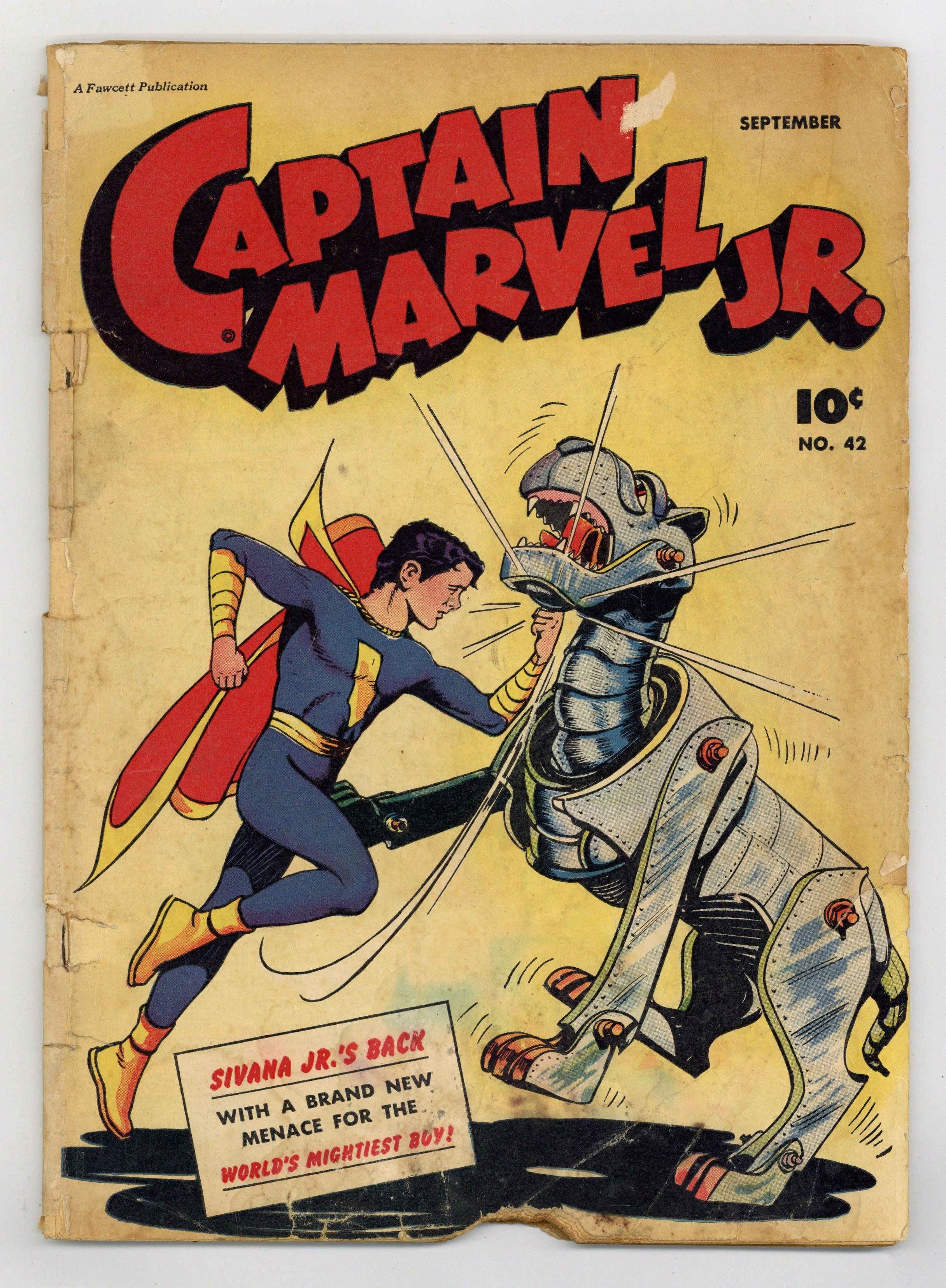Cover by Bud Thompson. Stories by Otto Binder, Art Helfant and Sid Lazarus. Art by Art Helfant, Sid Lazarus and Bud Thompson. Superhero action with Freddy Freeman, who gains the same powers as his hero Captain Marvel, better known these days as Shazam. Captain Marvel Jr. tracks a killer who brings common sayings like "look before you leap" to deadly new heights. Sivana Jr. escapes prison with help from Sivana Sr., and terrorizes the city with his gigantic robot dog. Freddy Freeman angers the Spirit of Superstition, who then curses him and Captain Marvel Jr. with bad luck. The Mysterious Axioms; Rubbernose Randolph; Boxcar Benny; Giggle Gags; Sivana, Jr. Strikes Again; Whitey Whiskers and Daniel Boone, Jr.; The Amazing Zugqumps; Snortville Sneeze: Ghost Story; Whipper-Snappers; The Silver Satan; Seven Years of Bad Luck; The Brutal Truth. 48 pages, Full Color. Cover price $0.10.