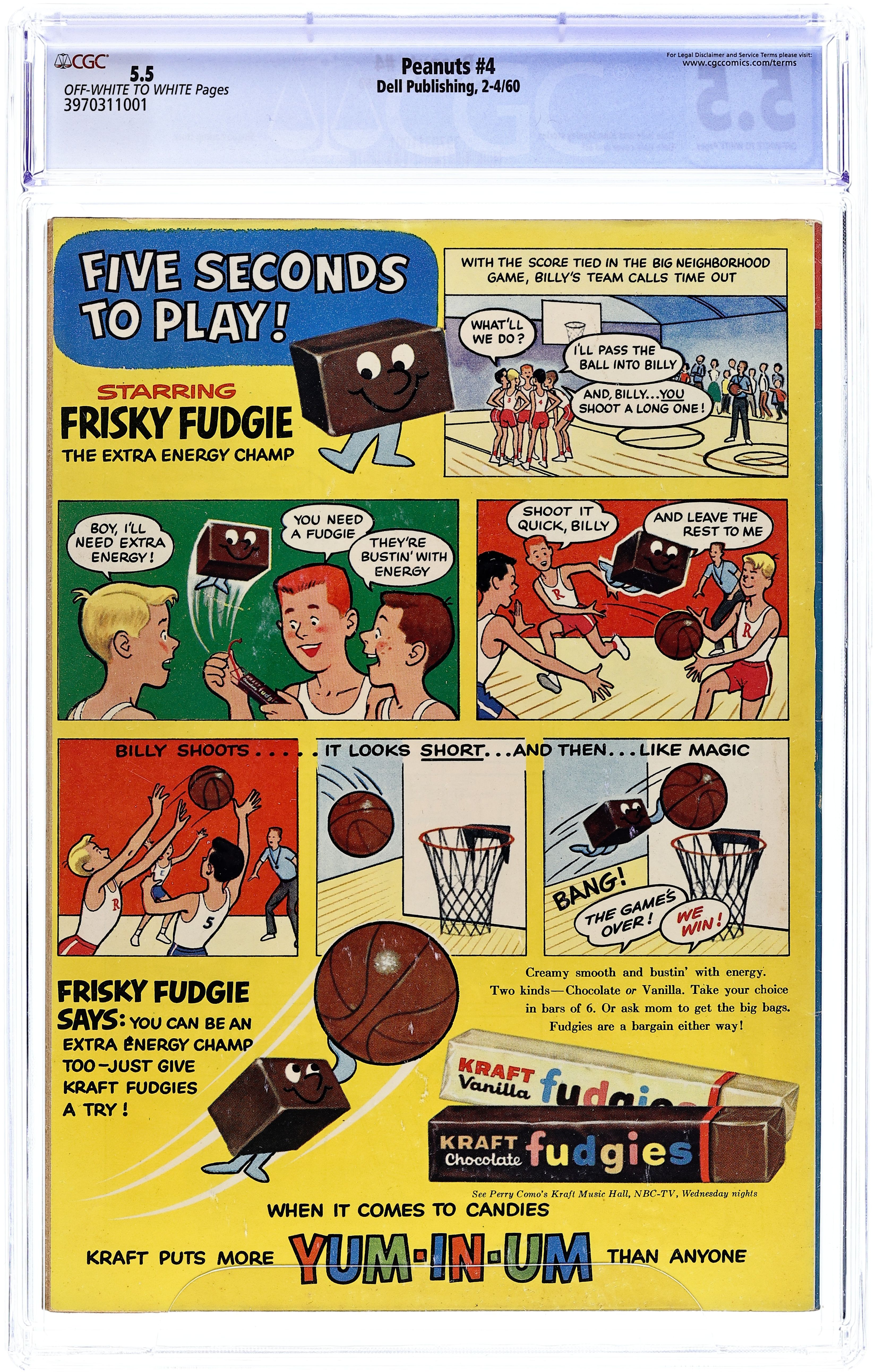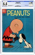 Cover by Charles Schulz. Stories and art by Anthony Pocrnich, Dale Hale and John Stanley. The three Peanuts issues of Four Color (1942-1962 Dell 2nd Series) count as the first three issues, in Dell's reckoning. A short-lived series translating Charles Schulz' beloved strip to comic books; Schulz only did the covers, farming out the interior stories to friends and co-workers. After Schroeder tosses an unwanted ring in her direction, Lucy starts telling everyone that she and Schroeder are engaged. Snoopy takes emergency measures to keep infant Sally out of trouble. Charlie Brown and Linus manage to catch a large fish, but when they find out what "cleaning" the fish really means, they throw it back. Plus a Sluggo story (as in Nancy and Sluggo) written by Little Lulu legend John Stanley. The Blowout; The Engagement Ring; Exploded Theory; The Junk King; Snoopy: The Haunted Hound; Blanket Washing Day; Sluggo: Crossed Blades; Muddled Menu; Fish Story; The Fabulous Outfielder. 32 pages, Full Color. Cover price $0.10.