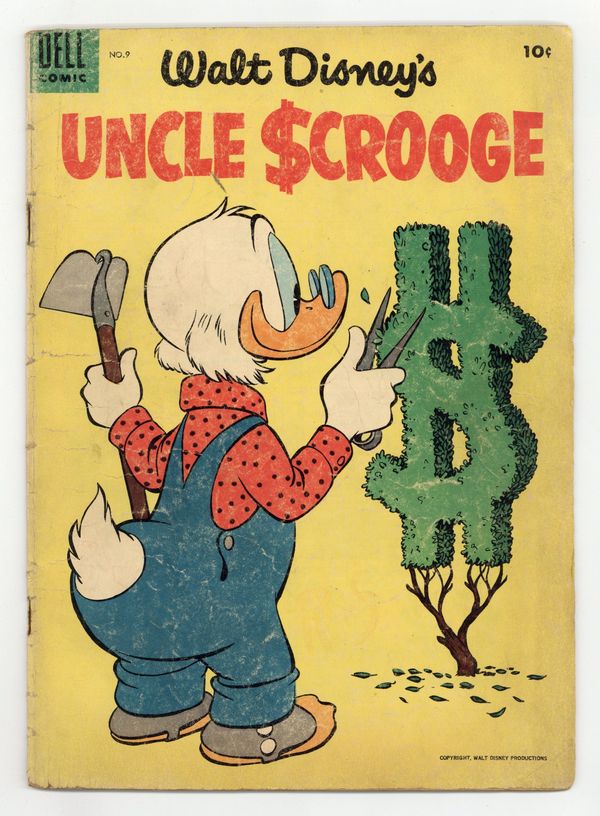 Published Mar 1955 by Dell/Gold Key/Whitman.$45.00Cover by Carl Barks. Stories and art by Carl Barks. Comics legend Carl Barks creates his masterpiece, featuring the adventures of Donald Duck's Uncle Scrooge, the richest duck in the world. A lemming gets hold of the combination to Scrooge's new safe, and Scrooge must find it amongst the millions of lemmings marching to the sea. This Carl Barks story was adapted into an episode of the beloved 1980s Disney cartoon show "Duck Tales." Scrooge bets his weight in diamonds that his horse can beat the Maharajah of Swingingdore's tiger in a race. Scrooge shows Donald his money-saving lawnmower: a sheep. The Lemming With the Locket; The Tuckered Tiger. 32 pages, Full Color. Cover price $0.10.