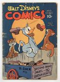 Cover by Walt Kelly. Stories and art by Walt Kelly, Carl Barks, Floyd Gottfredson, Merrill De Maris, Bob Karp, Hubie Karp, Carl Buettner, George Waiss, Veve Risto, Roger Armstrong, Manuel Gonzales, Sylvia Holland, Bill Wright, and Al Taliaferro. Sometimes listed as Vol. 4 #8. The long-running vehicle for Disney character comics featured work by Carl Barks, Floyd Gottfredson, and Pogo's Walt Kelly. In a classic Floyd Gottfredson story from the Mickey Mouse comic strip, Professor Dustibones enlists Mickey for a journey to a land of prehistoric creatures. In a story by Barks, Donald becomes a genius after a blow to the head and creates a new rocket fuel. This story is famous among certain segments of the scientific community for Donald's casual (and coincidental) mention of a rare chemical compound amidst his pseudo-scientific gobbledygook. Plus a one-pager by Kelly that doubles as a victory garden PSA and a contest. The Mad Chemist; Bucky Bug; Mickey Mouse; Tied to the Steak; Out of the Hat into the Fire!; The Victory Garden; Charge!!!; Cricket on the Hearth!; Donald Carries a Spare!; A Patriotic Yank!; Mickey Mouse: In the Land of Long Ago; That's Cooking With Gas! 48 pages, Full Color. Cover price $0.10.