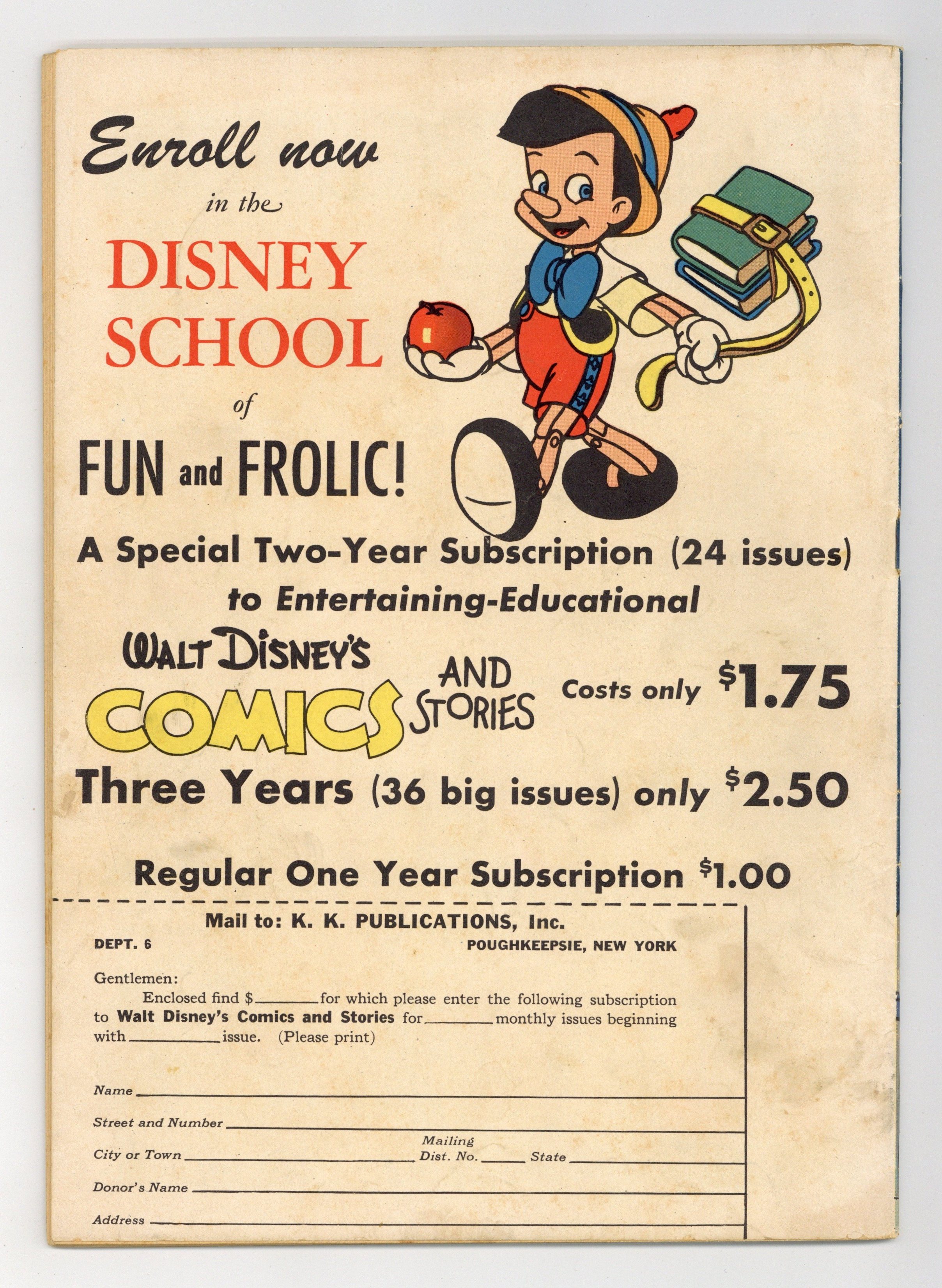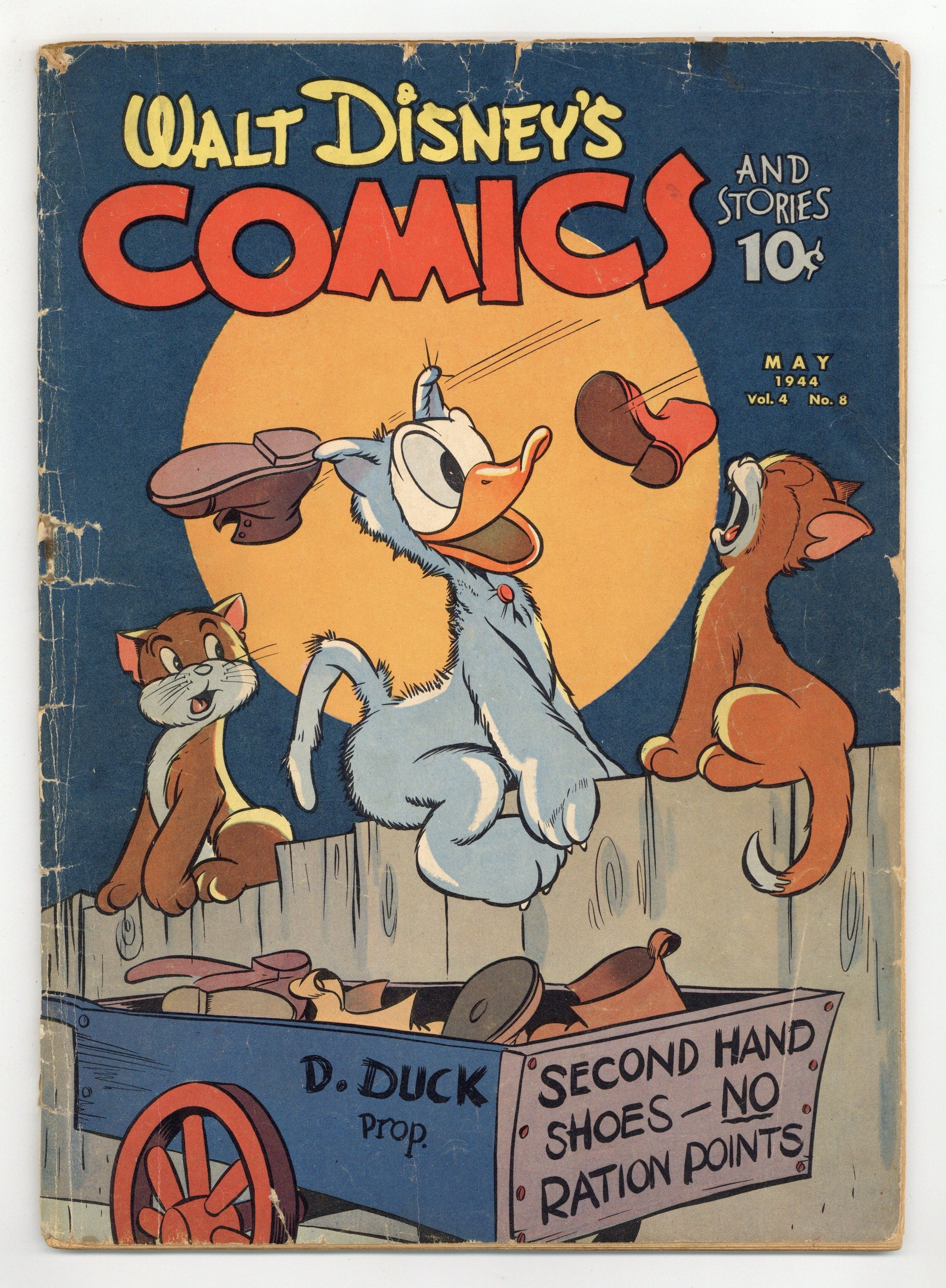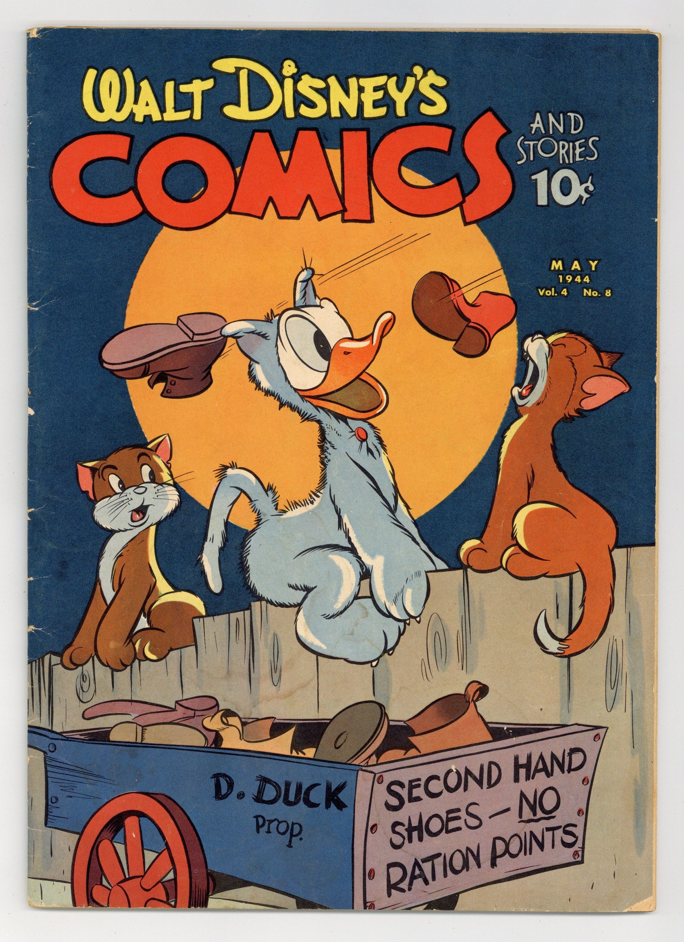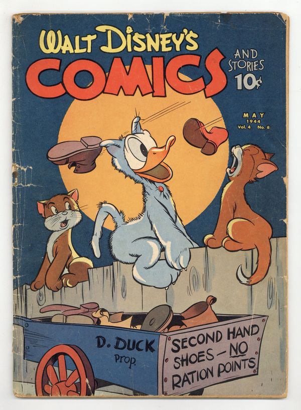 Tags: Disney Ducks & MicePublished May 1944 by Dell/Gold Key.$59.00Cover by Walt Kelly. Stories and art by Walt Kelly, Carl Barks, Floyd Gottfredson, Merrill De Maris, Bob Karp, Hubie Karp, Carl Buettner, George Waiss, Veve Risto, Roger Armstrong, Manuel Gonzales, Sylvia Holland, Bill Wright, and Al Taliaferro. Sometimes listed as Vol. 4 #8. The long-running vehicle for Disney character comics featured work by Carl Barks, Floyd Gottfredson, and Pogo's Walt Kelly. In a classic Floyd Gottfredson story from the Mickey Mouse comic strip, Professor Dustibones enlists Mickey for a journey to a land of prehistoric creatures. In a story by Barks, Donald becomes a genius after a blow to the head and creates a new rocket fuel. This story is famous among certain segments of the scientific community for Donald's casual (and coincidental) mention of a rare chemical compound amidst his pseudo-scientific gobbledygook. Plus a one-pager by Kelly that doubles as a victory garden PSA and a contest. The Mad Chemist; Bucky Bug; Mickey Mouse; Tied to the Steak; Out of the Hat into the Fire!; The Victory Garden; Charge!!!; Cricket on the Hearth!; Donald Carries a Spare!; A Patriotic Yank!; Mickey Mouse: In the Land of Long Ago; That's Cooking With Gas! 48 pages, Full Color. Cover price $0.10.