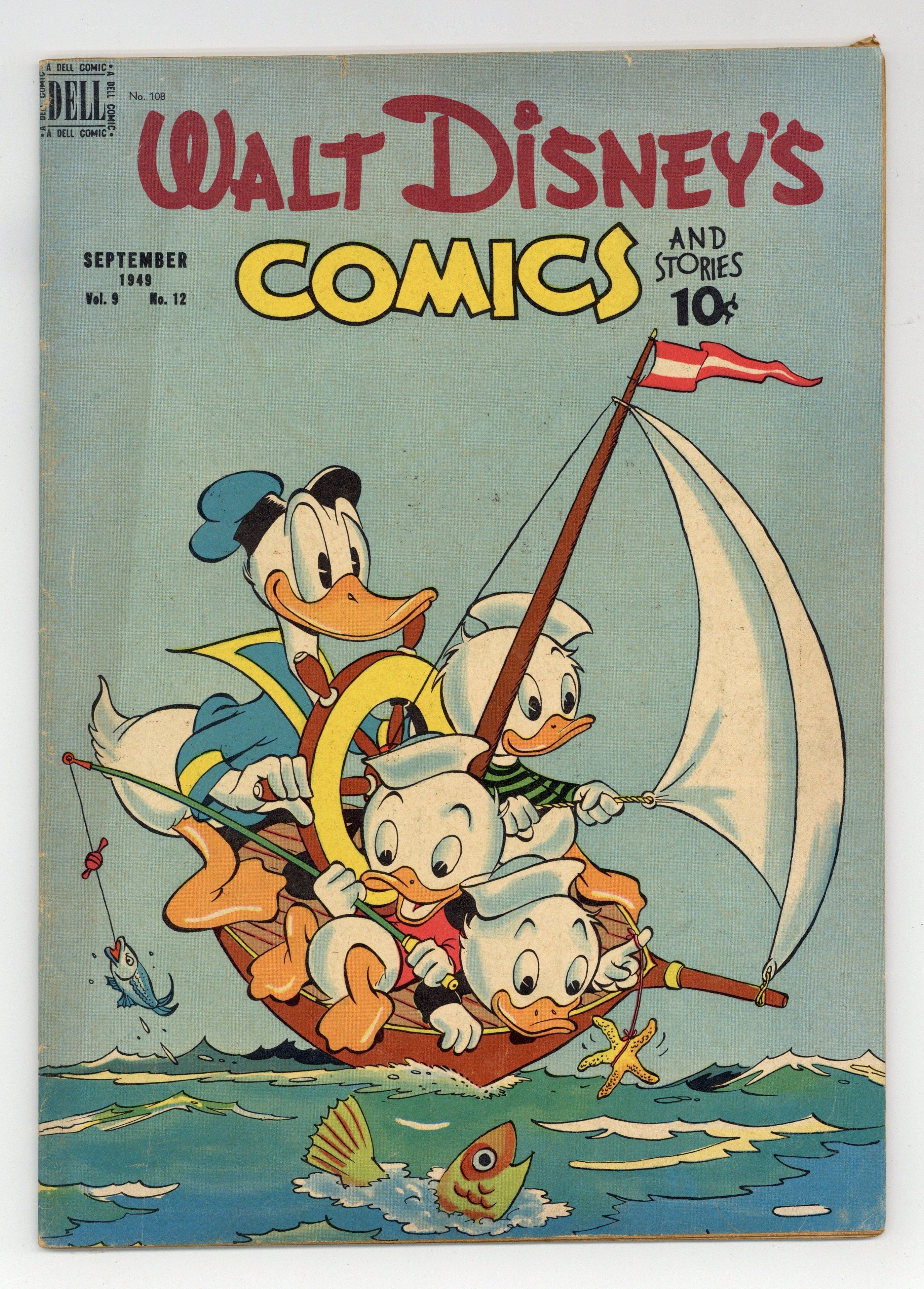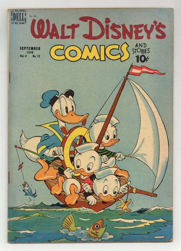 Cover by Carl Barks. Stories and art by Carl Barks, Floyd Gottfredson, Bill Walsh, Dick Moores, Bob Karp, Gil Turner, George Waiss, Bill Wright, Manuel Gonzales, and Al Taliaferro. Sometimes listed as Vol. 9 #12. The long-running vehicle for Disney character comics featured work by Carl Barks, Floyd Gottfredson, and Pogo's Walt Kelly. In a classic story from the Mickey Mouse comic strip, Mickey, Goofy and Donald meet the seven ghosts that haunt Colonel Bassett's house. In a story by Barks, Donald enters a frog in a jumping contest against Snake Eyes McViper. Bucky Bug and Bo search for the pot of gold at the end of a rainbow. Donald Duck; Bucky Bug; Li'l Bad Wolf; Mickey Mouse; Bongo's Best Show; Mickey Mouse in the House of Seven Haunts. 48 pages, Full Color. Cover price $0.10.