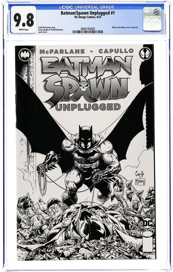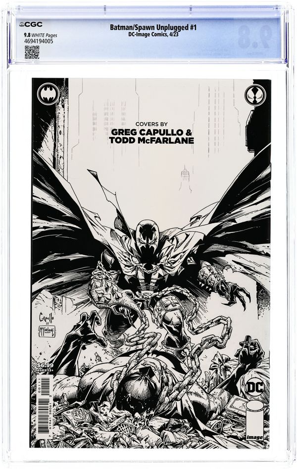 Written by Todd McFarlane. Art and Cover by Greg Capullo. Two dark heroes, cursed by tragedy, find their paths again crossing...but not by choice! What sinister foe is at work, pitting the Dark Knight against the Hellspawn? From the shadows of Gotham City to New York City, this epic event is the blockbuster you've been waiting almost two decades for! 48 pages, full B&W. Rated Teen Cover price $6.99.