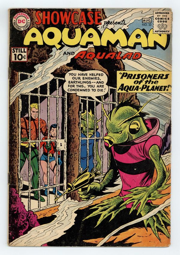 Cover pencils by Dick Dillin, inks by Sheldon Moldoff. Prisoners of the Aqua-Planet starring Aquaman, Aqualad, and Mermor. Aquaman and Aqualad meet Mermor, an alien from Venus who was driven to Earth by the tyrant Naeco. The Alien Creature Ambush; Aquaman and Aqualad are captured along with Mermor and taken to Venus. King of the Land Creatures; Aquaman helps Mermor and his followers in overthrowing the tyrant Naeco. Scripts by Jack Miller, art by Nick Cardy. 36 Pages, Full Color. Cover price $0.10.
