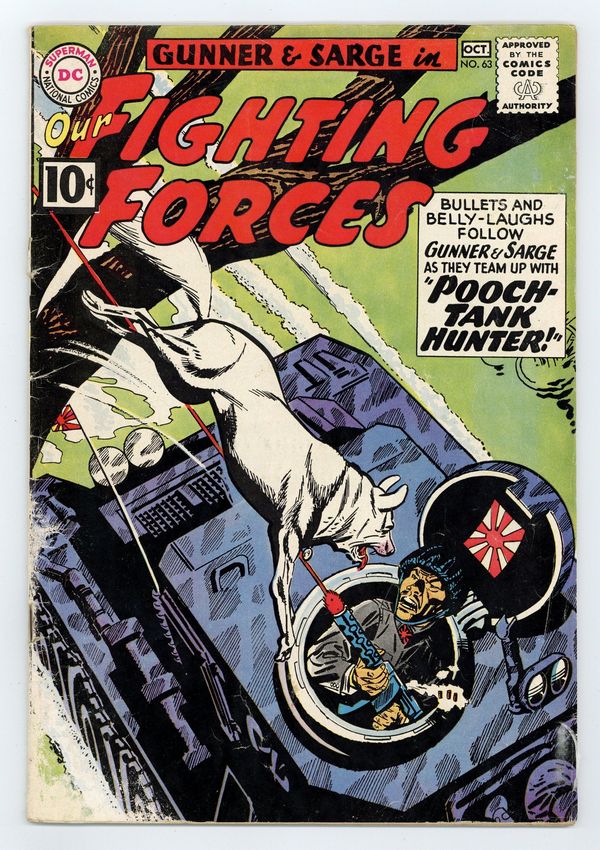 $19.00Gunner and Sarge in "A Lifeline For Sarge!" Also "Frogman in a Fog" (art by Joe Kubert) and "They Took Away the Sky!" (art by Russ Heath). Full-page ad for Sea Devils # 1. 36 Pages, Full Color. Cover price $0.10.