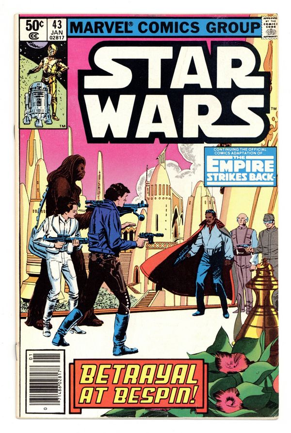 Starts Apr 4 Newsstand Edition. The Empire Strikes Back: Part 5 of 6. "Betrayal at Bespin!" Based on the screenplay by George Lucas. Adapted by Archie Goodwin. Art by Al Williamson and Carlos Garzon. After their narrow escape from the pursuing Empire Fleet, the crew of the Millennium Falcon sets down on the Cloud City of Bespin for repairs. Lando Calrissian, proprietor of the floating facility, is an old friend of Han's. But he is an old friend with some dark secrets. Meanwhile, Luke's training under the tutelage of the Jedi Master, Yoda, is cut short when the young padawan senses that his friends are in great danger. Against Yoda's better judgement Luke races to Cloud City and the stage is set for the greatest battle between the forces of good and evil. Includes 5 pin-ups by Terry Austin, Michael Golden, John Byrne, Marie Severin, and Frank Miller. Cover price $0.50.