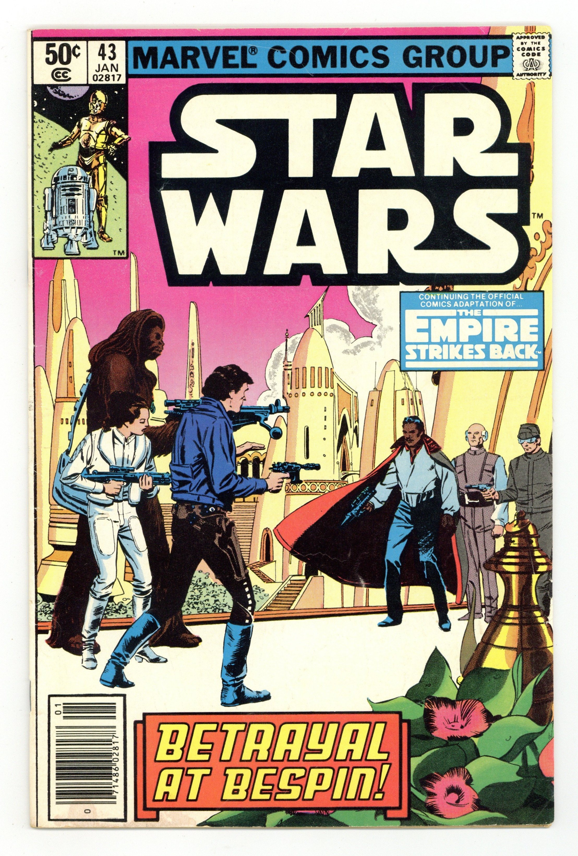 Newsstand Edition. The Empire Strikes Back: Part 5 of 6. "Betrayal at Bespin!" Based on the screenplay by George Lucas. Adapted by Archie Goodwin. Art by Al Williamson and Carlos Garzon. After their narrow escape from the pursuing Empire Fleet, the crew of the Millennium Falcon sets down on the Cloud City of Bespin for repairs. Lando Calrissian, proprietor of the floating facility, is an old friend of Han's. But he is an old friend with some dark secrets. Meanwhile, Luke's training under the tutelage of the Jedi Master, Yoda, is cut short when the young padawan senses that his friends are in great danger. Against Yoda's better judgement Luke races to Cloud City and the stage is set for the greatest battle between the forces of good and evil. Includes 5 pin-ups by Terry Austin, Michael Golden, John Byrne, Marie Severin, and Frank Miller. Cover price $0.50.