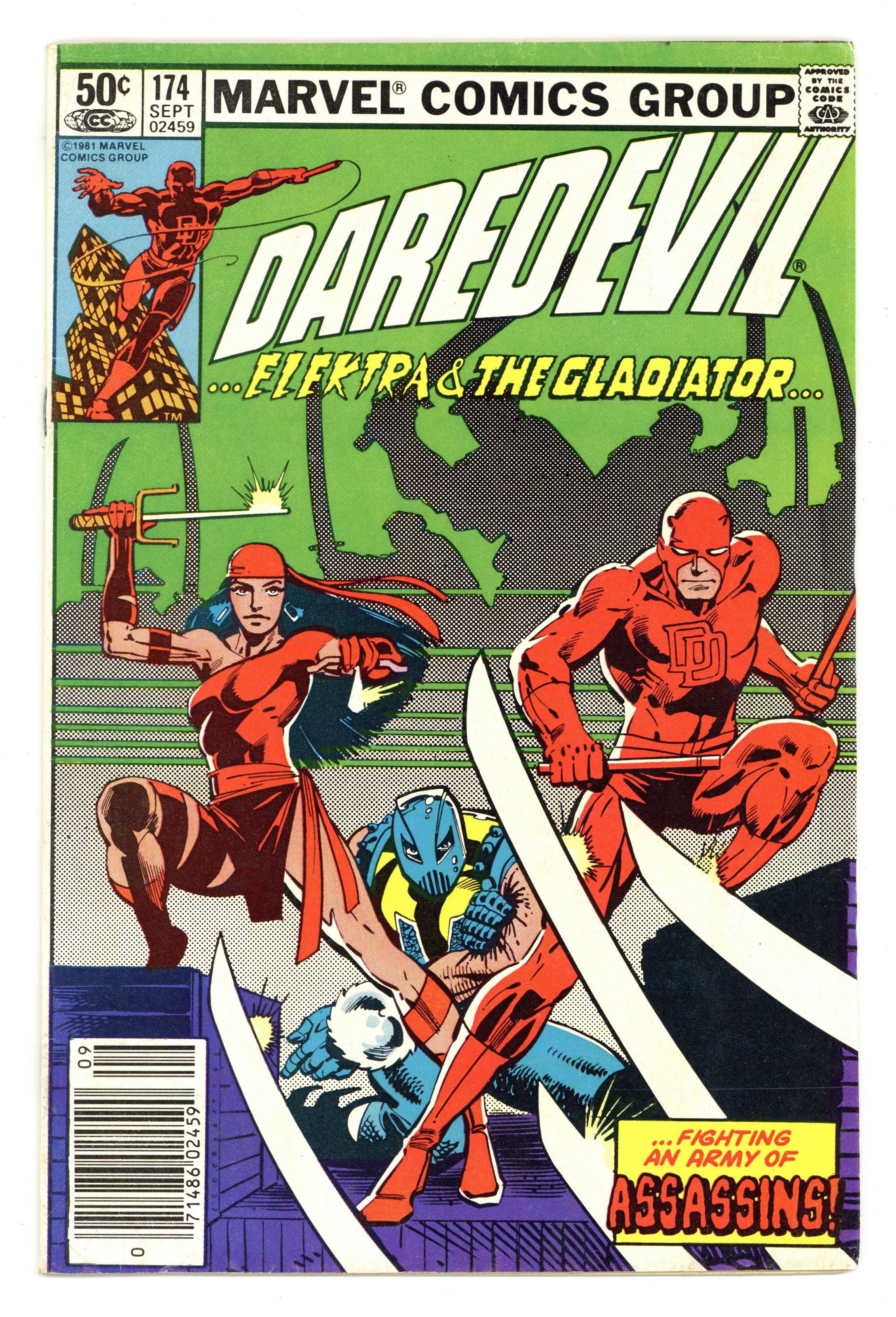 Newsstand Edition. Cover pencils by Frank Miller, inks by Klaus Janson. Elektra returns in The Assassination of Matt Murdock, script by Frank Miller, pencils by Frank Miller (breakdowns) and Klaus Janson (finished art), inks by Klaus Janson; Kingpin secretly hires the Hand to take out Matt Murdock, but Elektra and Gladiator get in the way; When the Hand blows up his law office, DD loses his radar sense due to the blast; 1st appearance of The Hand (ninja assassins). 36 pgs. Cover price $0.50. Cover price $0.50.