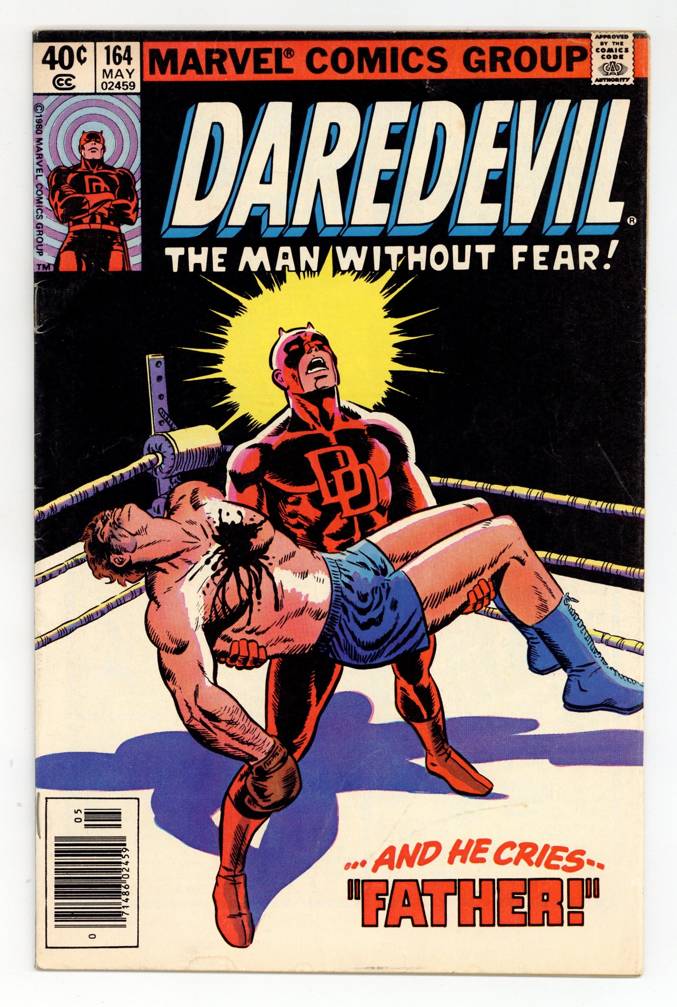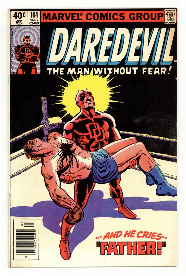 Newsstand Edition. Cover pencils by Frank Miller, inks by Wally Wood. Expose, script by Roger McKenzie, pencils by Frank Miller, inks by Klaus Janson; Ben Urich confronts a hospitalized Daredevil with his origin and identity, and DD tells him the whole story; appearances by the Black Widow, the Vision, the Scarlet Witch, Captain America, Thor (the Avengers), the Fantastic Four, Luke Cage, and Iron Fist. Previously unpublished Miller/Janson cover appears inside (probably originally intended for 162, though it states it's for 164). 36 pgs. Cover price $0.40. Cover price $0.40.