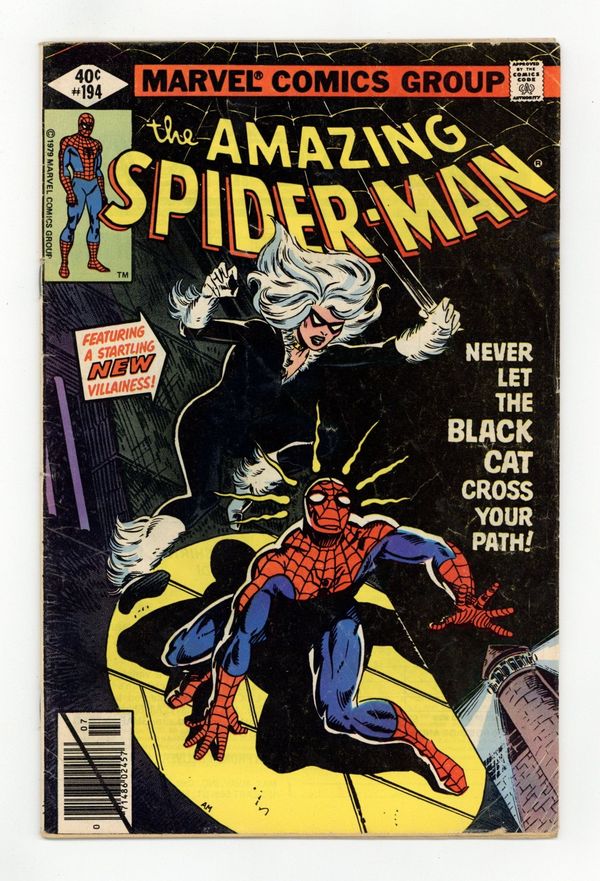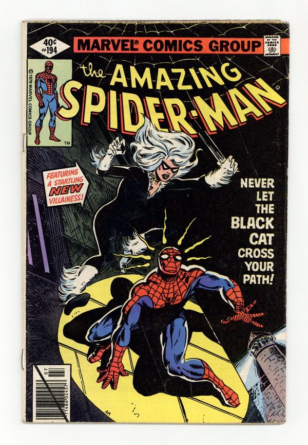 Direct Edition. First appearance of the Black Cat in "Never Let The Black Cat Cross Your Path!" Part 1 of 2. Script by Marv Wolfman. Art by Keith Pollard (breakdowns) and Frank Giacoia (finishes). Cover by Al Milgrom. One of the landmark issues of the Amazing Spider-Man series! The dazzling debut of the Black Cat! The wall-crawler has spent the first 193 issues of his title chasing super-villains! But tonight he's going to kiss one instead! Wow! Does the web-slinger stand a chance against the beauty and charm of Felicia Hardy? Not when the alluring cat has his tongue! And maybe later his heart! A terrific issue! Cameo appearances by Aunt May, Betty Brant, Ned Leeds, Harry Osborn, Flash Thompson, Mysterio (in civilian clothes), and the burglar. (Notes: The Black Cat is the creative highlight of the Wolfman-Pollard run on the Amazing Spider-Man title. Dave Cockrum designed the cat's costume. The letters page includes an alternate cover (for issue 194) by Keith Pollard. It also includes an alternate cover to Spider-Woman 9 by Carmine Infantino. This two-part story was reprinted in the trade paperback: Spider-Man vs. the Black Cat (2005). 36 pages, full color. Cover price $0.40.
