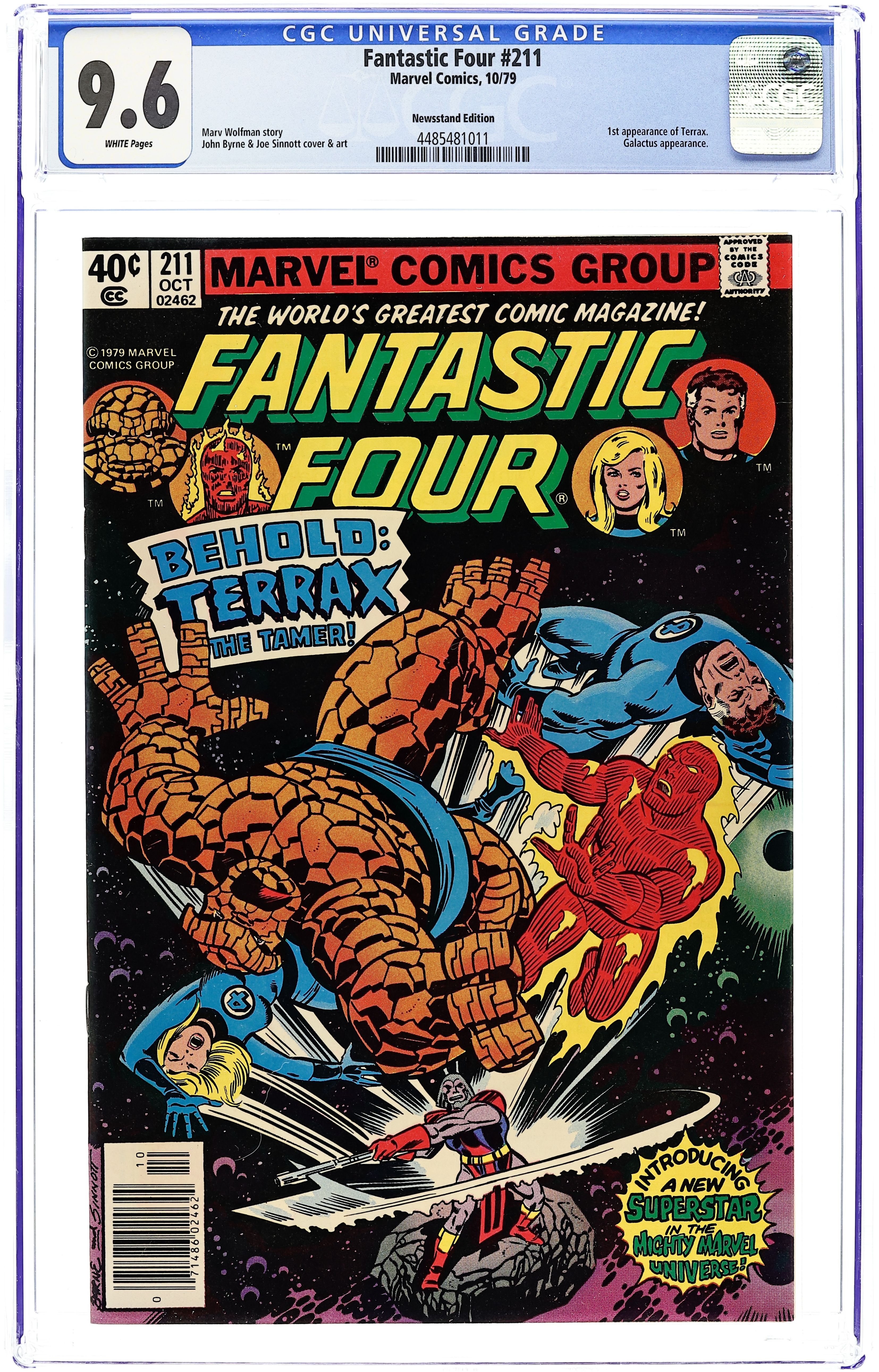 Newsstand Edition. 1st appearance of Terrax the Tamer - "If This Be Terrax" Written by Marv Wolfman. Pencils by John Byrne. Inks by Joe Sinnott. Cover by John Byrne and Joe Sinnott. Galactus sends the Fantastic Four to an alien plant to capture its tyrannical ruler named Tyros! Can the three aging members of the FF plus the Human Torch muster the strength to defeat Tyros? Cameo appearance by the Watcher and flashback appearances by the Silver Surfer, Air Walker, and Firelord. Note: First appearance of Terrax the Tamer. 36 pgs. Cover price $0.40.