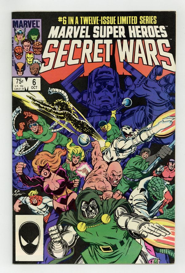 Tags: Hero/Villain Teams$18.00Direct Edition. "A Little Death...!" Part 6 of 12. Story by Jim Shooter. Art by Mike Zeck and John Beatty. As Doctor Doom continues to explore the massive homeworld of Galactus, he discovers the nefarious Klaw and recruits the sound-master to his cause. Meanwhile, the X-Men, Cyclops, Rogue, and Wolverine, battle for their lives against four of Marvel's deadliest villains, Doctor Octopus, Titania, Molecule Man, and the Absorbing Man. Plus, within these pages, the first casualty of war. 36 pages, full color. Cover price $0.75.