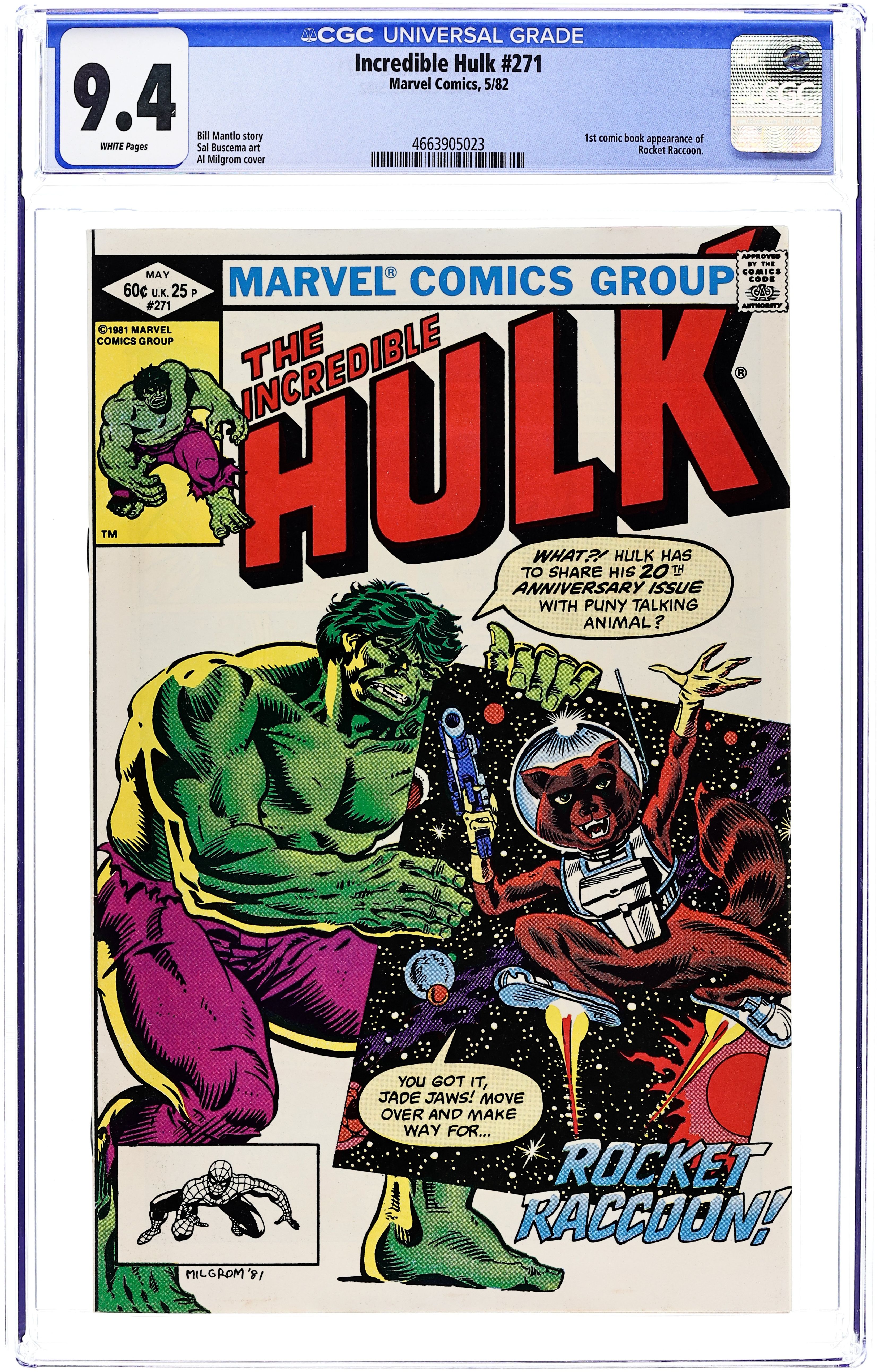 Direct Edition. 2nd appearance of Rocket Raccoon (see Marvel Preview #7 for 1st appearance). Story by Bill Mantlo. Art by Sal Buscema. The Hulk celebrates his 20th Anniversary with one of the most offbeat stories of all. Following the events of last issue, Hulk hurtles through the void only to run into the marvelous Rocket Raccoon and his band of colorful friends. Can the Hulk aid Rocket and his crew against the machiavellian Judson Jakes and his sinister scientist, the tortoise Uncle Pyko? 36 pages. Cover price $0.60.