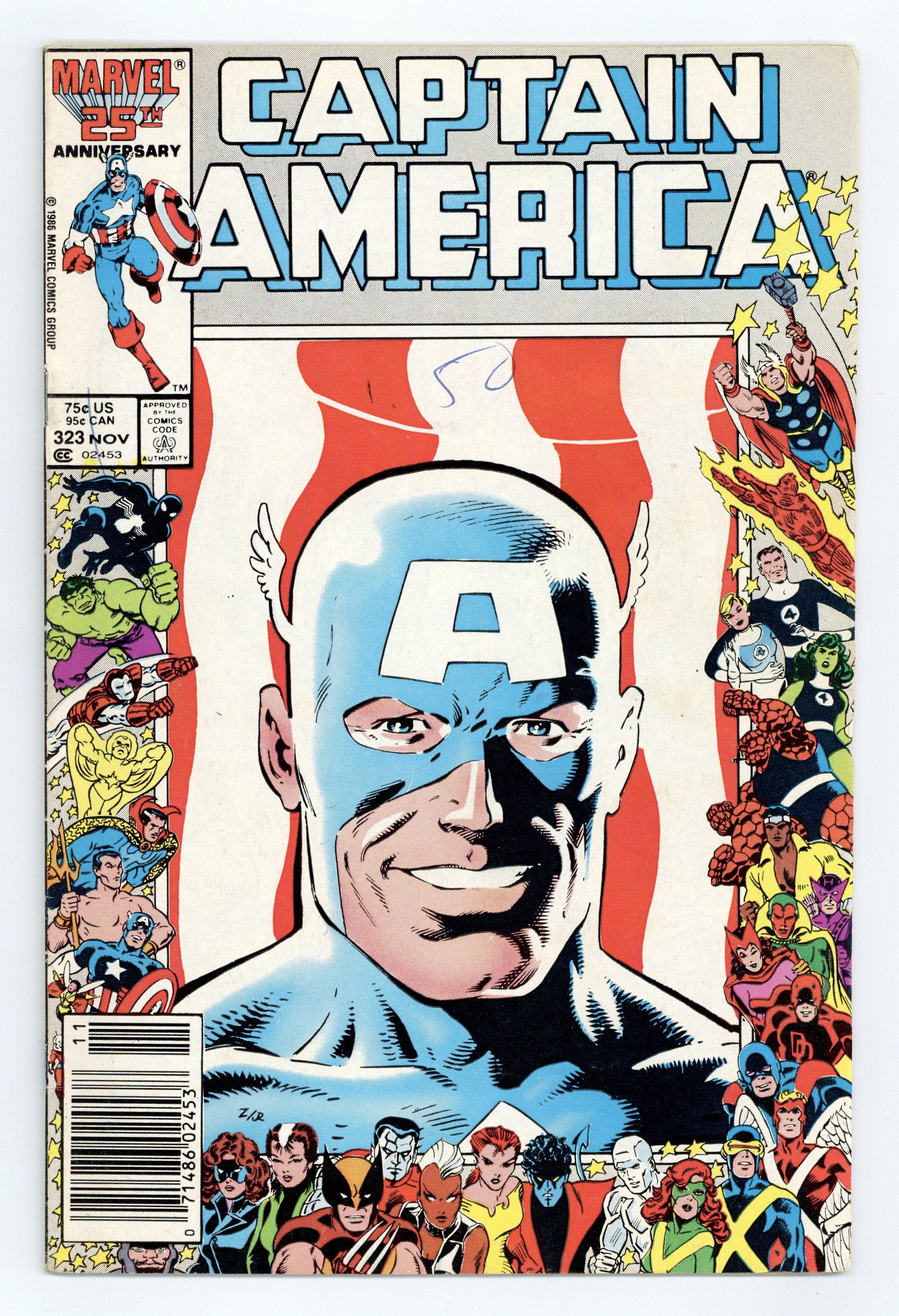 Newsstand Edition. Marvel 25th Anniversary Cover - 1st appearance of new Super Patriot (US Agent), John Walker in "Super-Patriot is Here." Story by Mark Gruenwald. Art by Paul Neary and John Beatty. Cover by Mike Zeck and Josef Rubinstein. Captain America has received a lot of media attention after his shooting of an Ultimatum terrorist two issues ago. Now a new superhero called the Super-Patriot is trying to take Cap's place as America's patriotic hero. Cameo appearances by the Black Knight and Hercules. 36 pages Cover price $0.75.